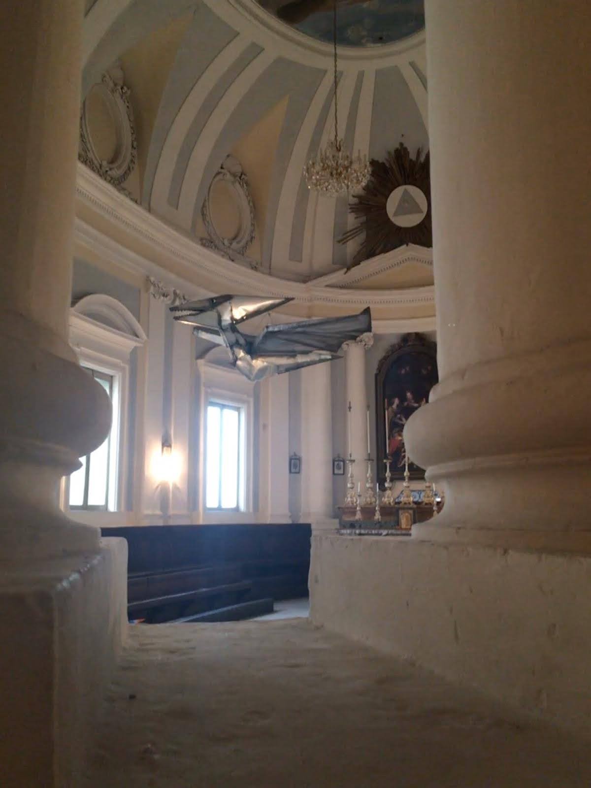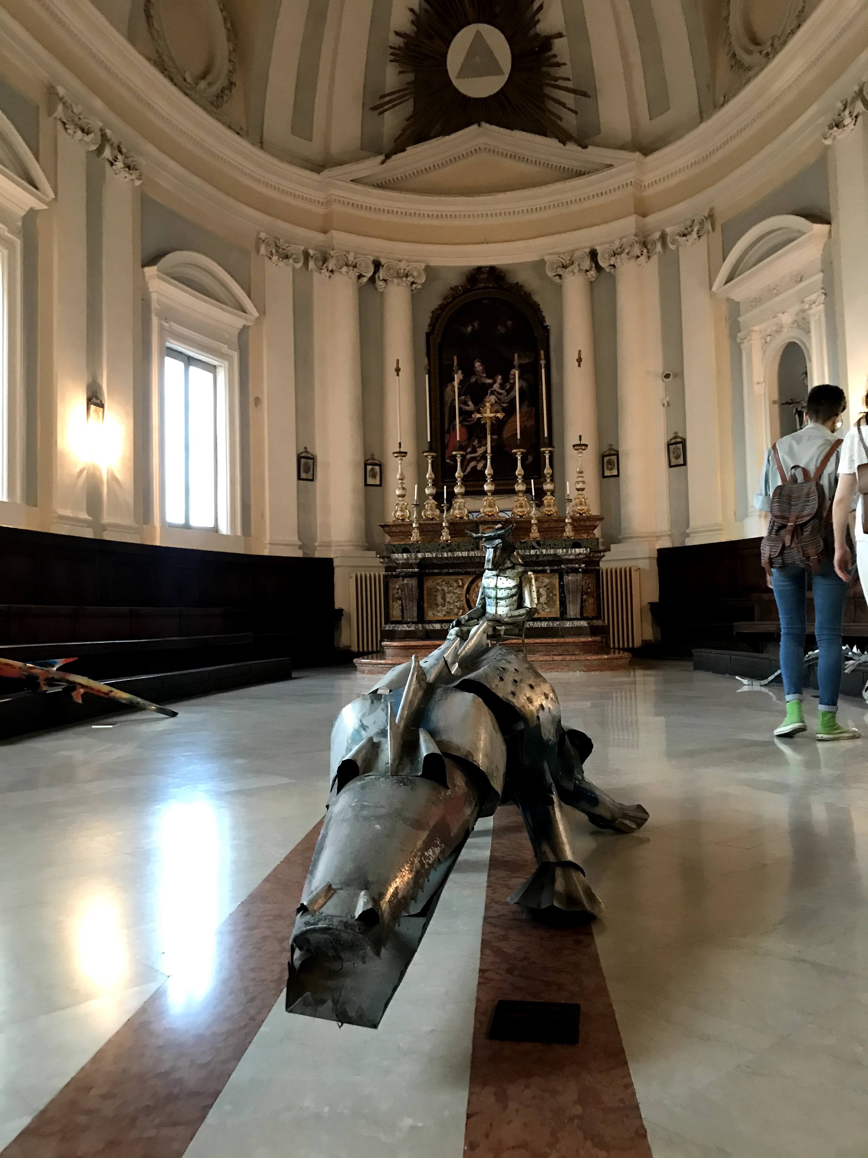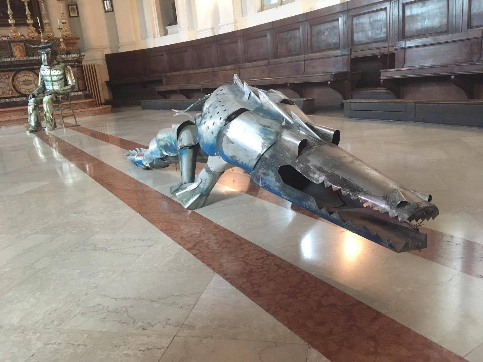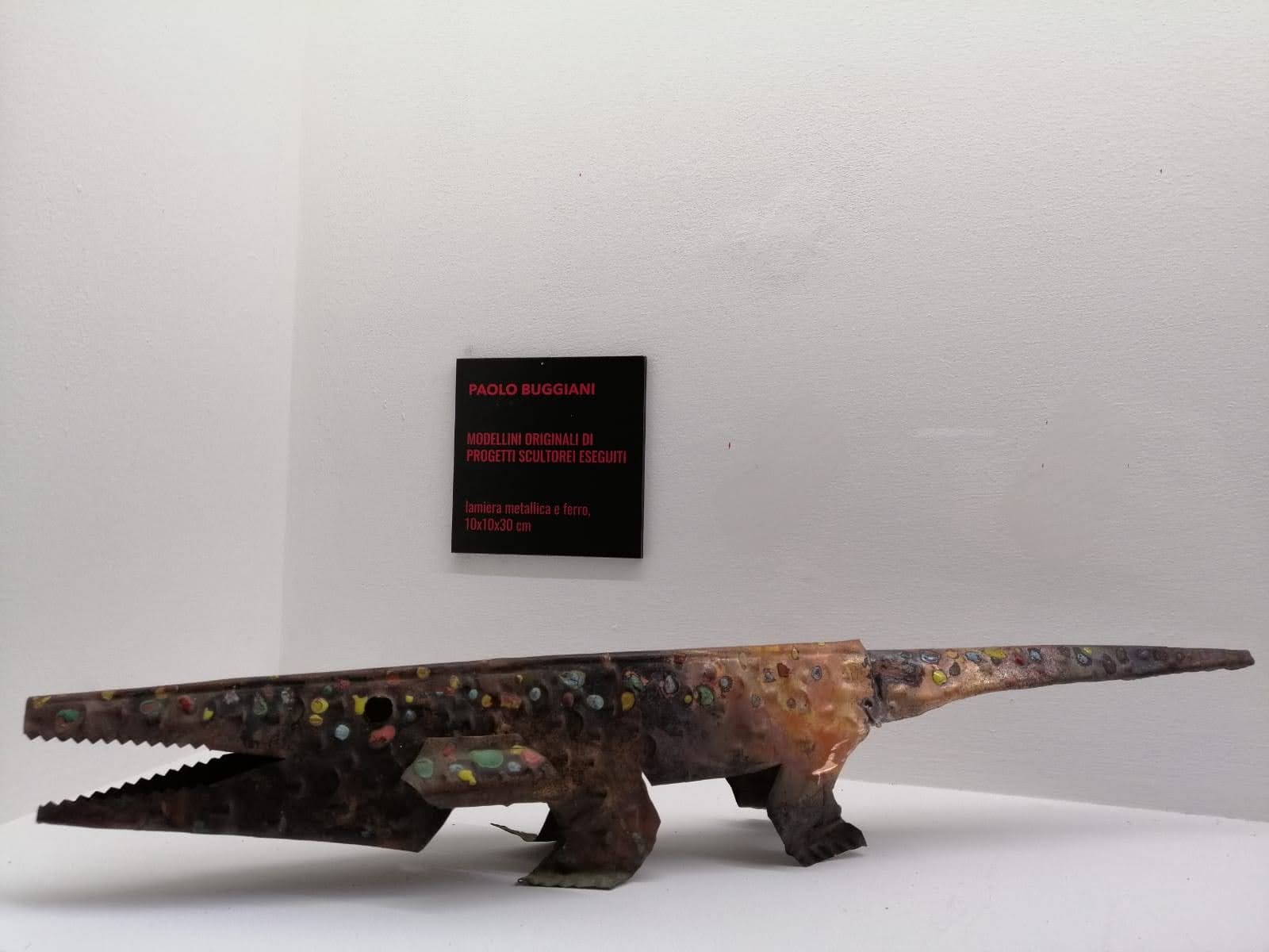 Nell’ultima sala della mostra, che consiste in una meravigliosa cappella sconsacrata del ‘700, troviamo l’allestimento di alcuni dei suoi animali in lamiera leggera: coccodrilli, serpenti e altri rettili, accompagnati dalle celebri opere “il Minotauro” e “Icaro”, due corpi mitologici che sono stati indossati dall’artista durante le sue performance dal vivo a New York. Come l’artista afferma: “La mia attività di ricerca è divisa in due parti: la prima continua il mio gioco intimo della pittura, mentre la seconda mi coinvolge in prima persona attraverso le sculture indossabili, gli oggetti, le macchine metamorfiche inserite nel contesto urbano e nella natura.” La scelta di usare anche la cappella, come sala espositiva, ha creato non poche polemiche in città, primo perché raramente nelle scorse esposizioni si era utilizzata la sala, secondo perché per molti si tratta di un tentativo non necessario, anzi volutamente provocatorio, di mischiare il sacro con il profano. A mio avviso, l’ultima sala è sicuramente la più interessante dell’intera mostra. Gli animaletti di Buggiani riescono ad integrasi perfettamente nell’ambiente della sala, tanto è vero che danno, al visitatore, l’effetto di volersi riposare in un luogo ameno dopo i lunghi viaggi in giro per il mondo.