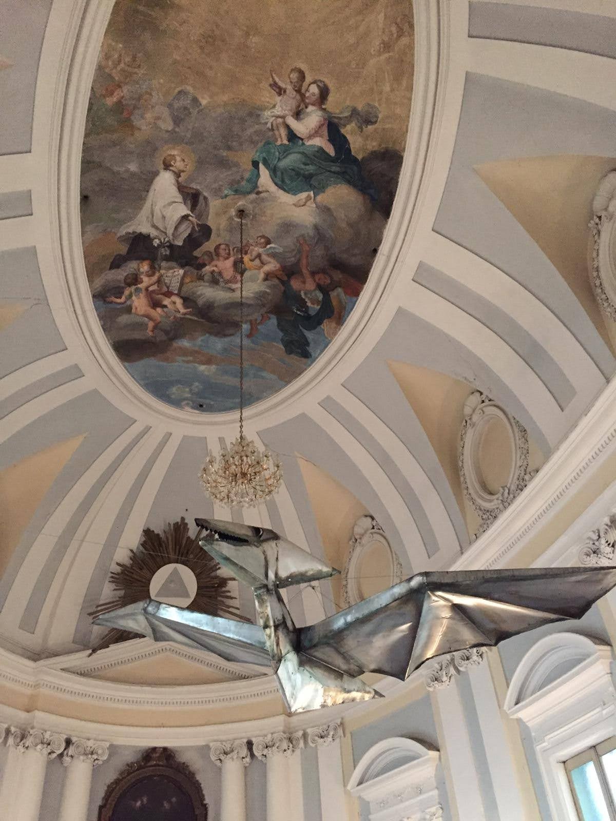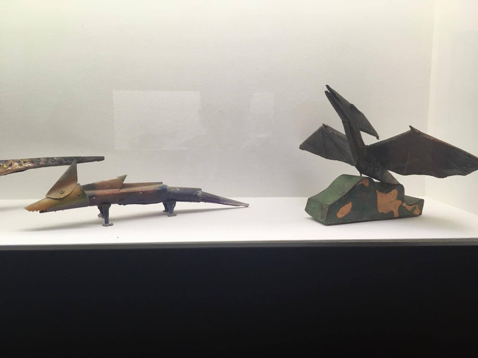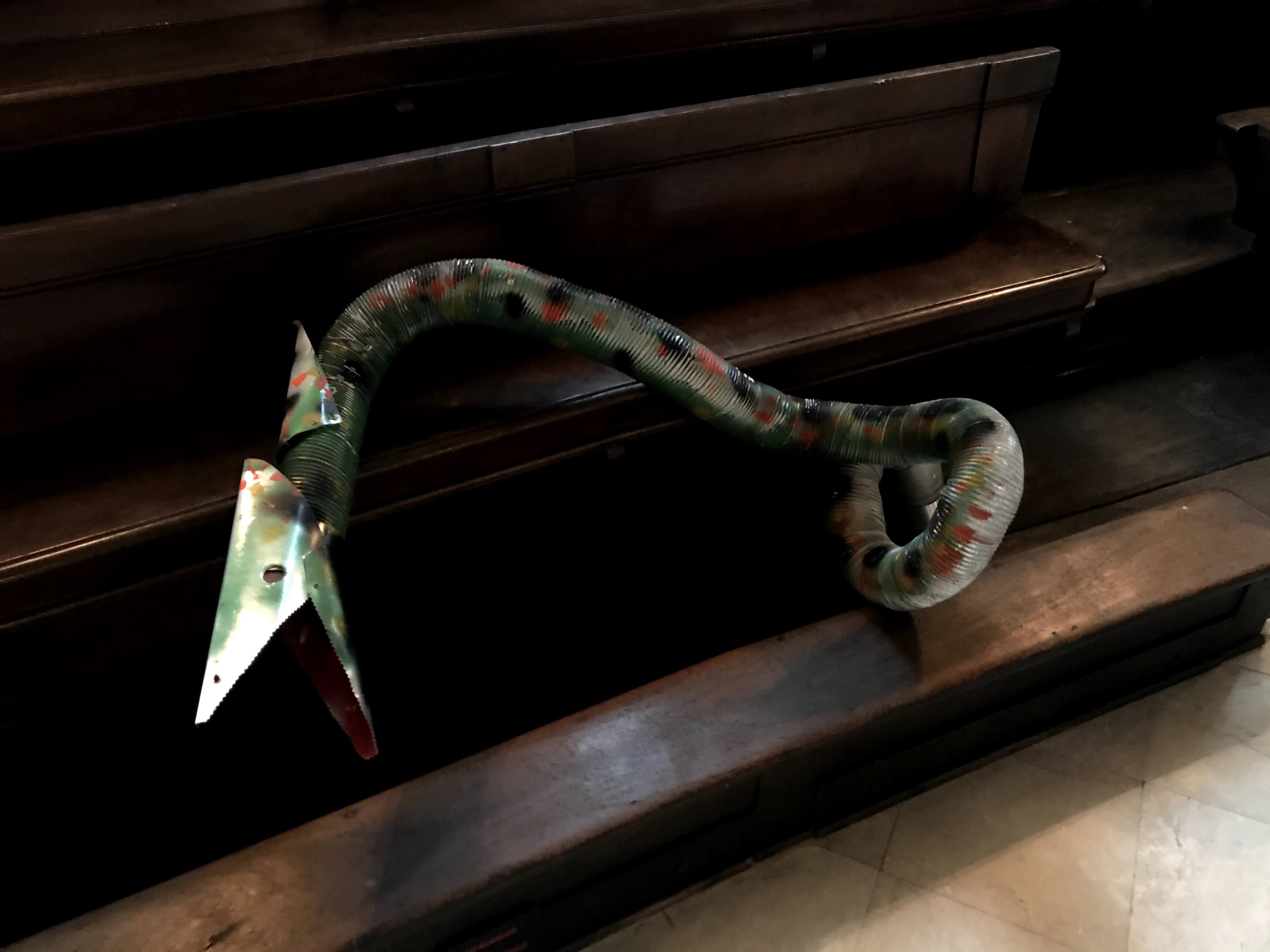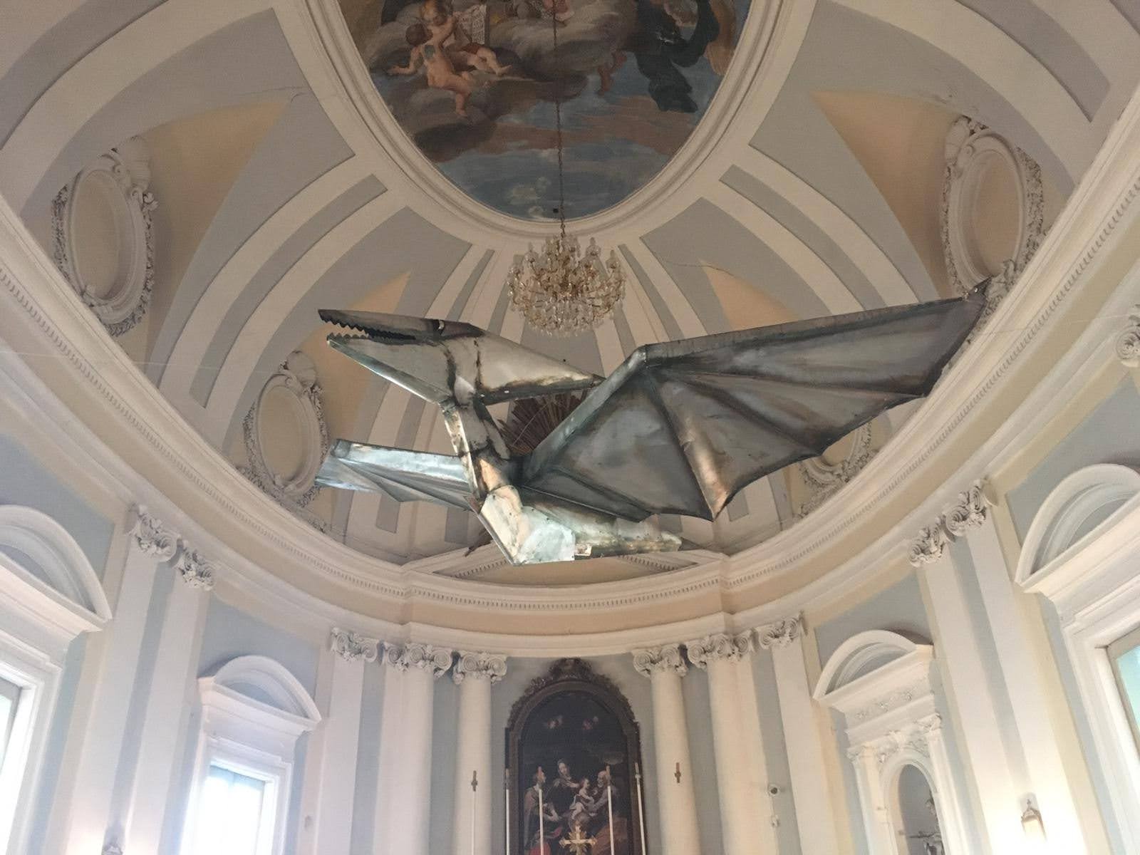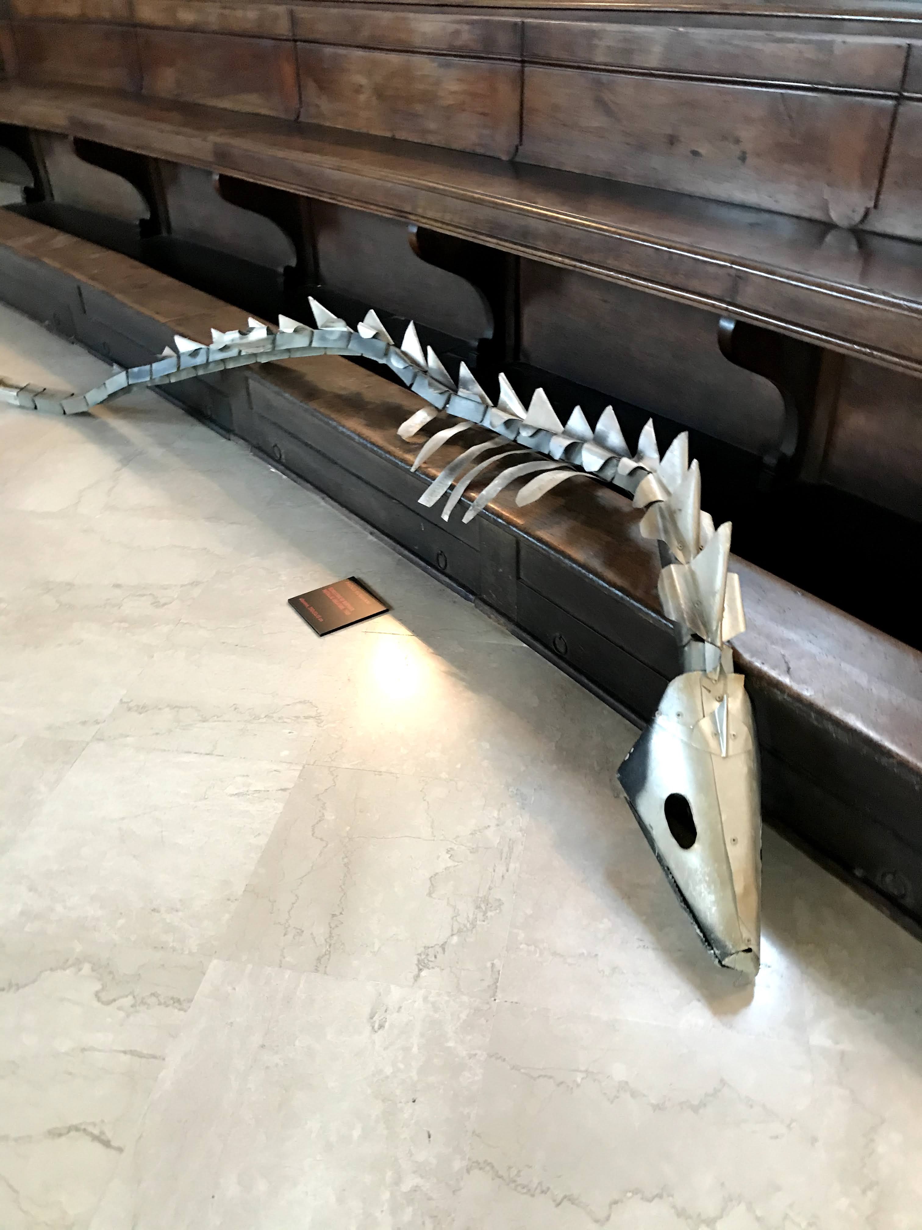 Nell’ultima sala della mostra, che consiste in una meravigliosa cappella sconsacrata del ‘700, troviamo l’allestimento di alcuni dei suoi animali in lamiera leggera: coccodrilli, serpenti e altri rettili, accompagnati dalle celebri opere “il Minotauro” e “Icaro”, due corpi mitologici che sono stati indossati dall’artista durante le sue performance dal vivo a New York. Come l’artista afferma: “La mia attività di ricerca è divisa in due parti: la prima continua il mio gioco intimo della pittura, mentre la seconda mi coinvolge in prima persona attraverso le sculture indossabili, gli oggetti, le macchine metamorfiche inserite nel contesto urbano e nella natura.” La scelta di usare anche la cappella, come sala espositiva, ha creato non poche polemiche in città, primo perché raramente nelle scorse esposizioni si era utilizzata la sala, secondo perché per molti si tratta di un tentativo non necessario, anzi volutamente provocatorio, di mischiare il sacro con il profano. A mio avviso, l’ultima sala è sicuramente la più interessante dell’intera mostra. Gli animaletti di Buggiani riescono ad integrasi perfettamente nell’ambiente della sala, tanto è vero che danno, al visitatore, l’effetto di volersi riposare in un luogo ameno dopo i lunghi viaggi in giro per il mondo.