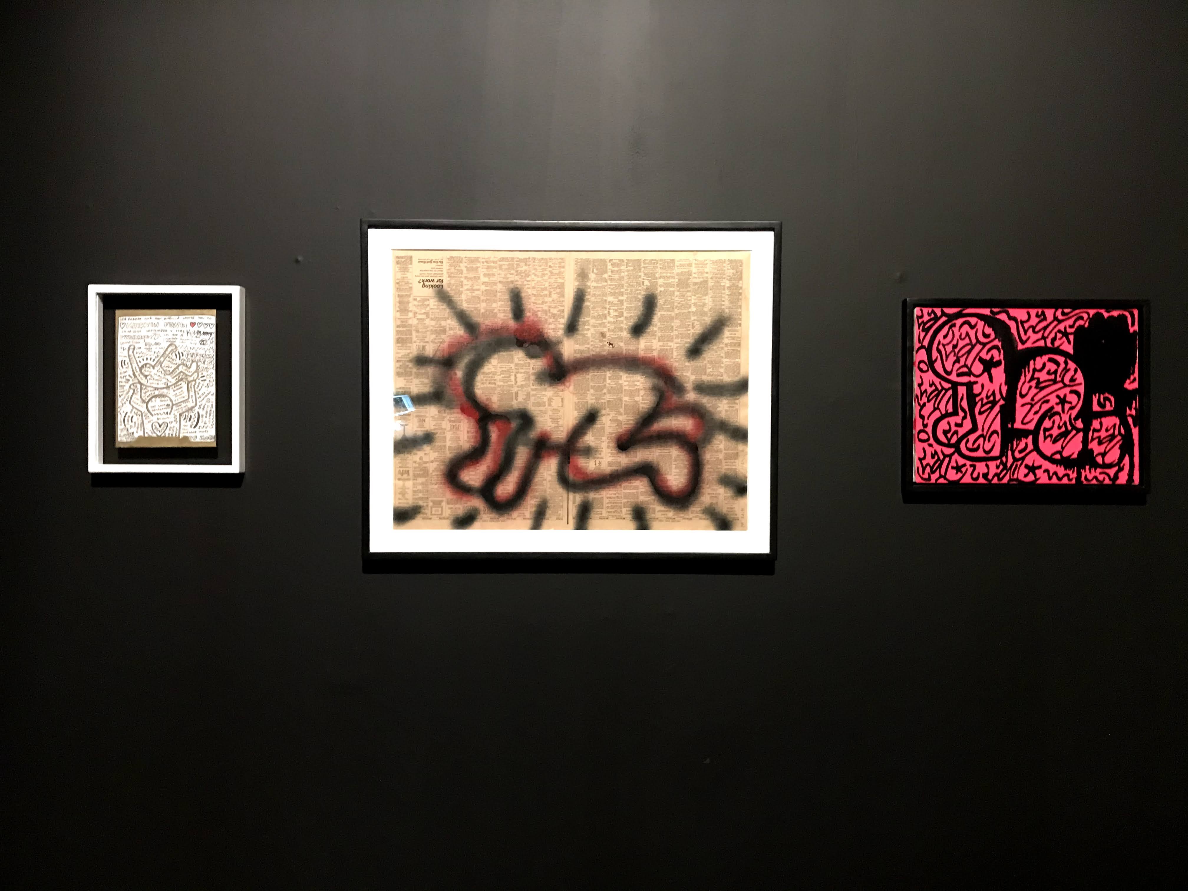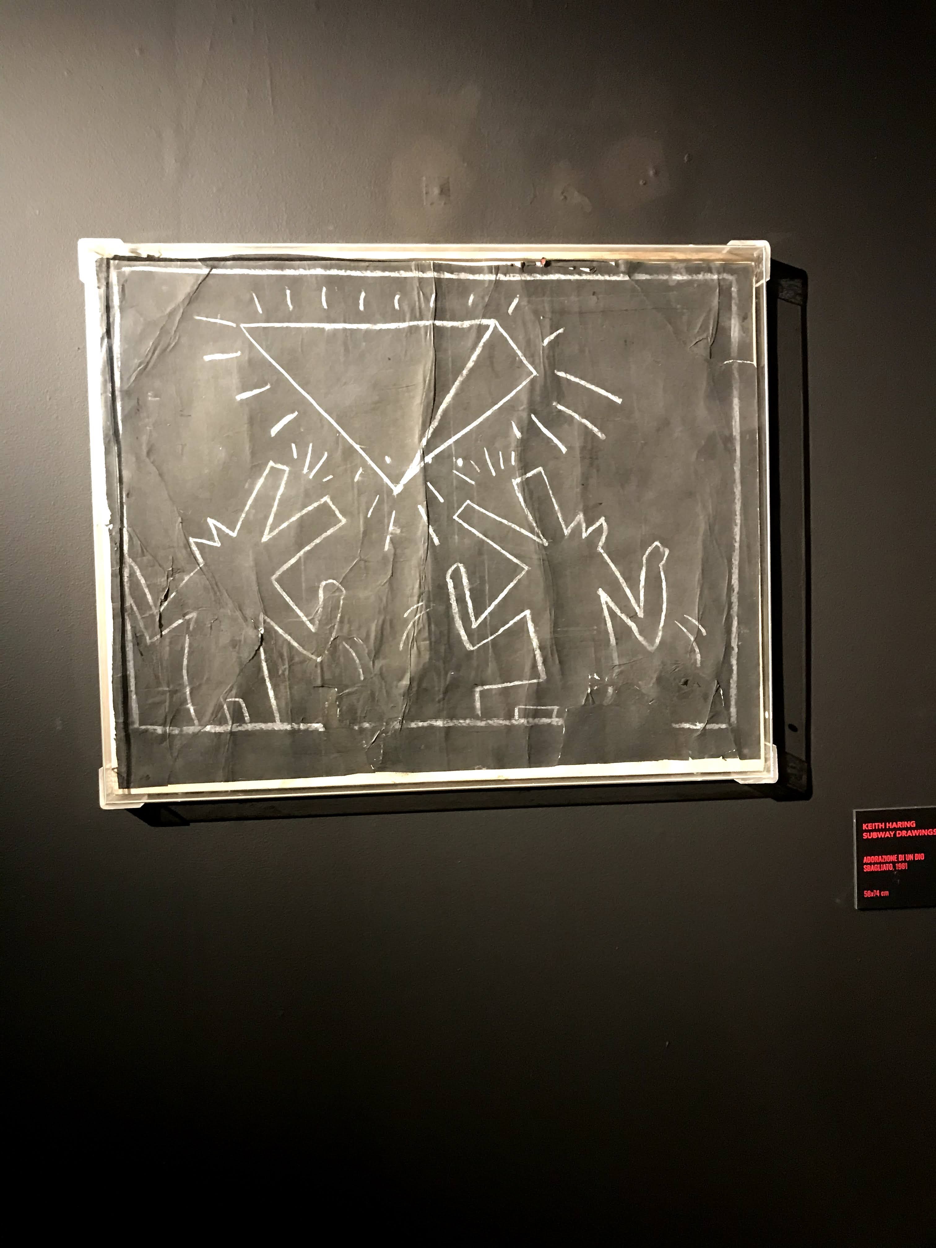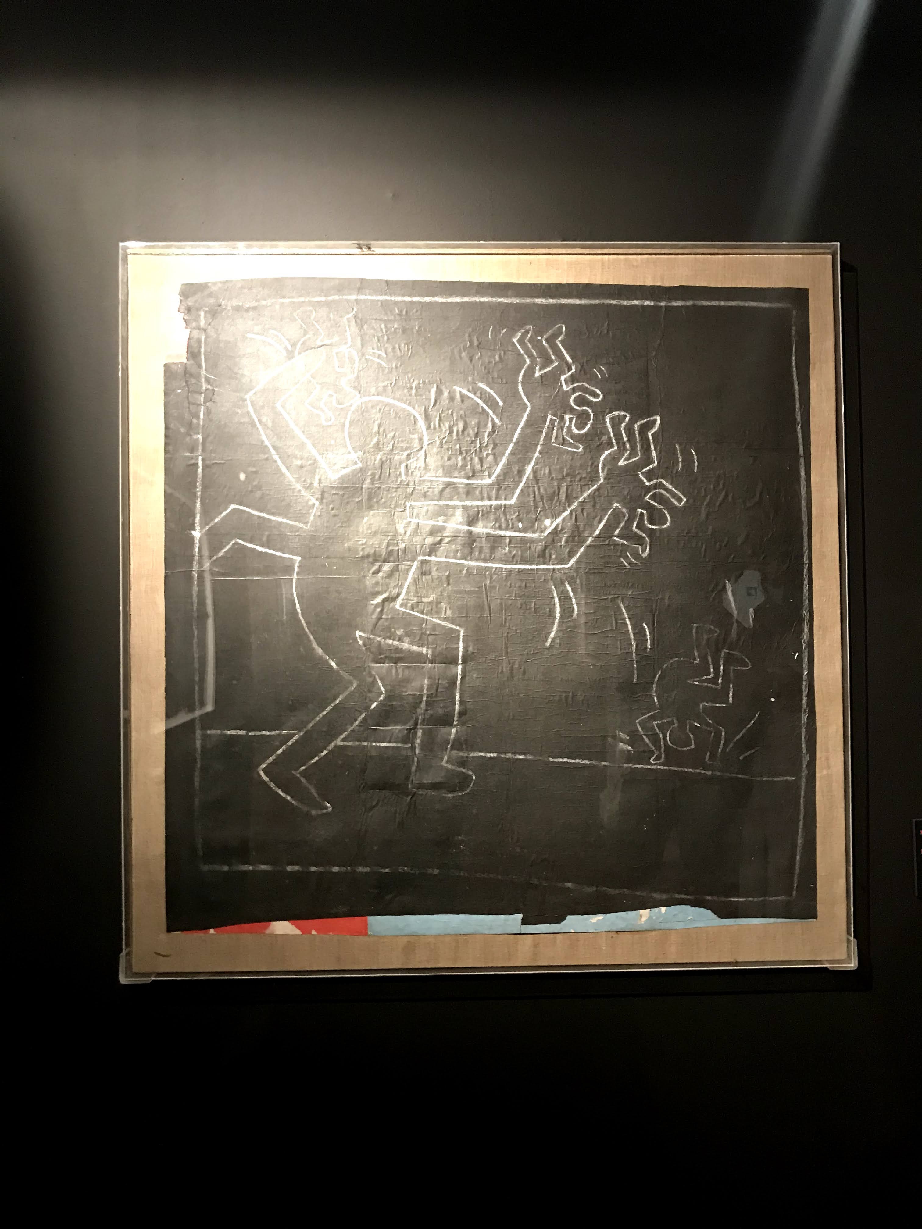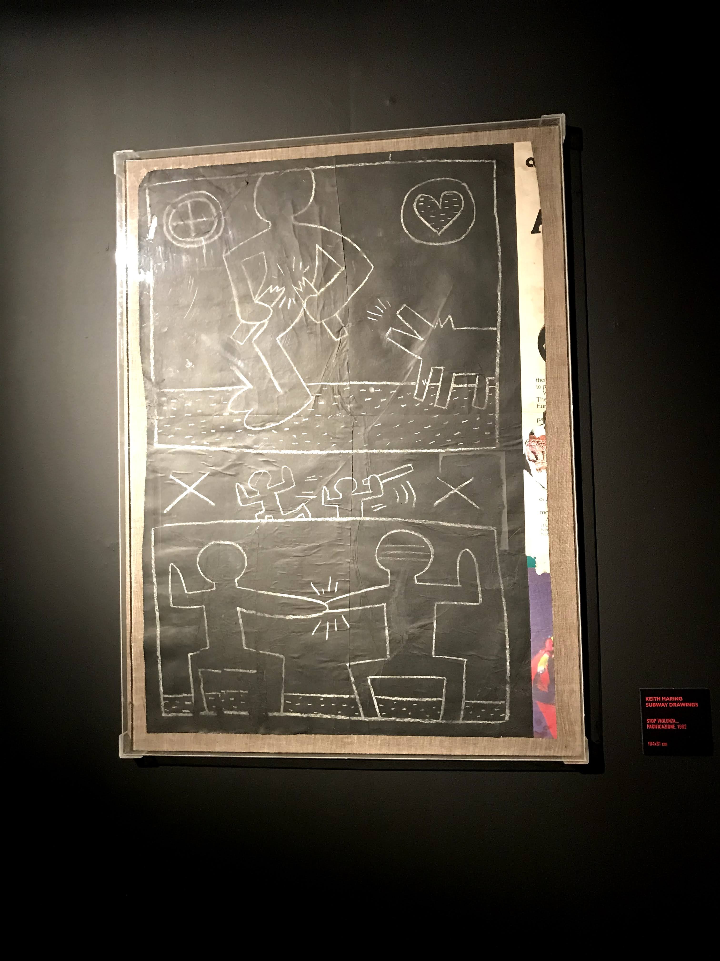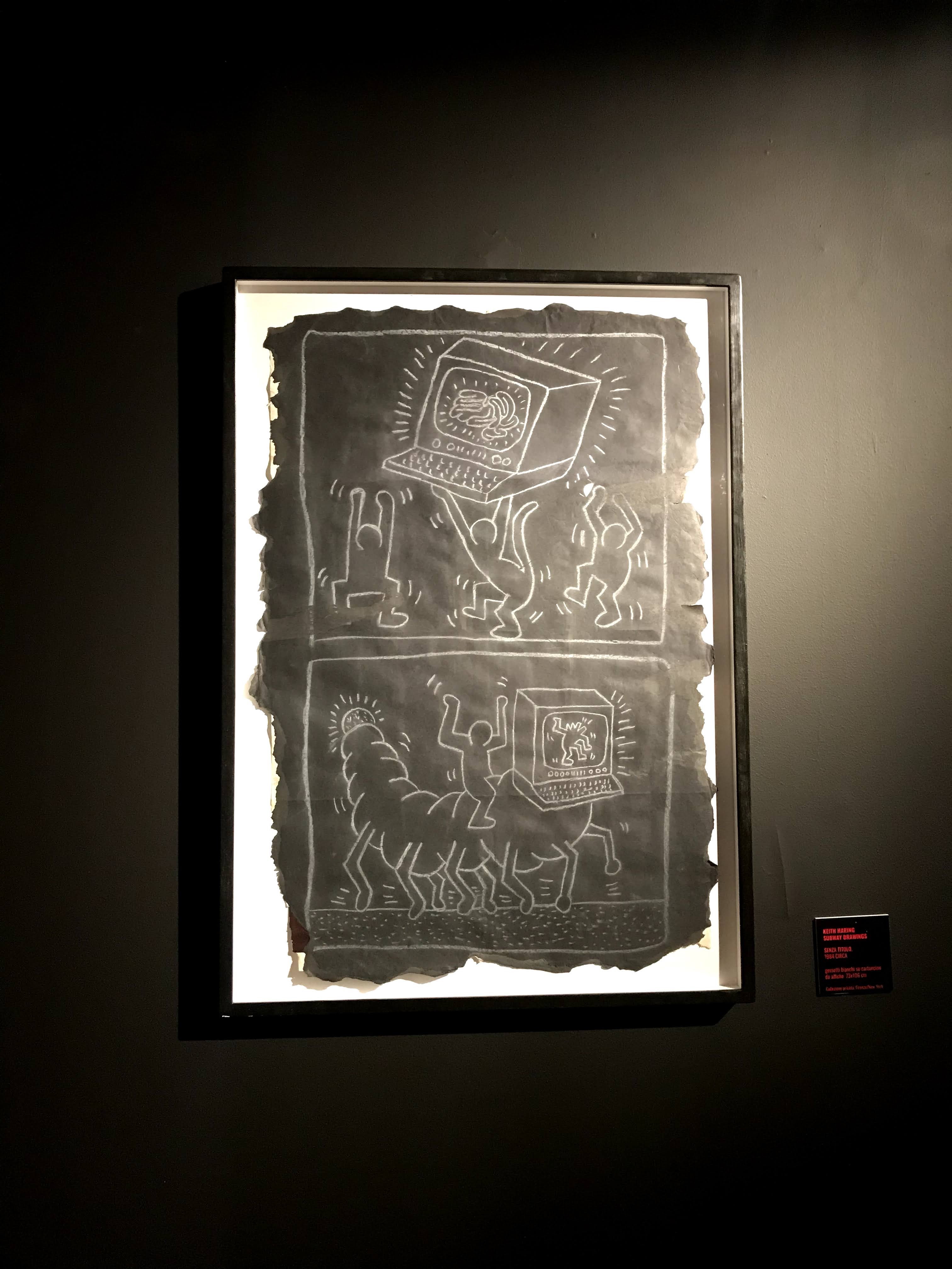La prima sezione della mostra si concentra sull’iniziale fase dell’artista americano dedicata ai “subway drawings”, ovvero i disegni realizzati con il gessetto bianco sopra i fogli di carta nera della municipalità di New York, che venivano affissi per coprire le pubblicità scadute delle banchine della metropolitana. Già da questa sala si scopre come sia stato Paolo Buggiani a conservare queste opere, che quasi sicuramente senza il suo intervento sarebbero andate perdute. I primi lavori di Haring, infatti, erano ben lontani dal circuito di gallerie e musei, poiché rappresentavano l’essenza genuina della Street Art newyorkese. I “subway drawings” venivano realizzati in rapida sequenza, contro il volere delle autorità e sotto gli occhi complici dei passanti. Questi graffiti sono solo un accenno del grande talento dell’artista, ma riescono a far cogliere all’osservatore l’evoluzione delle figure stilizzate tipiche di Haring.