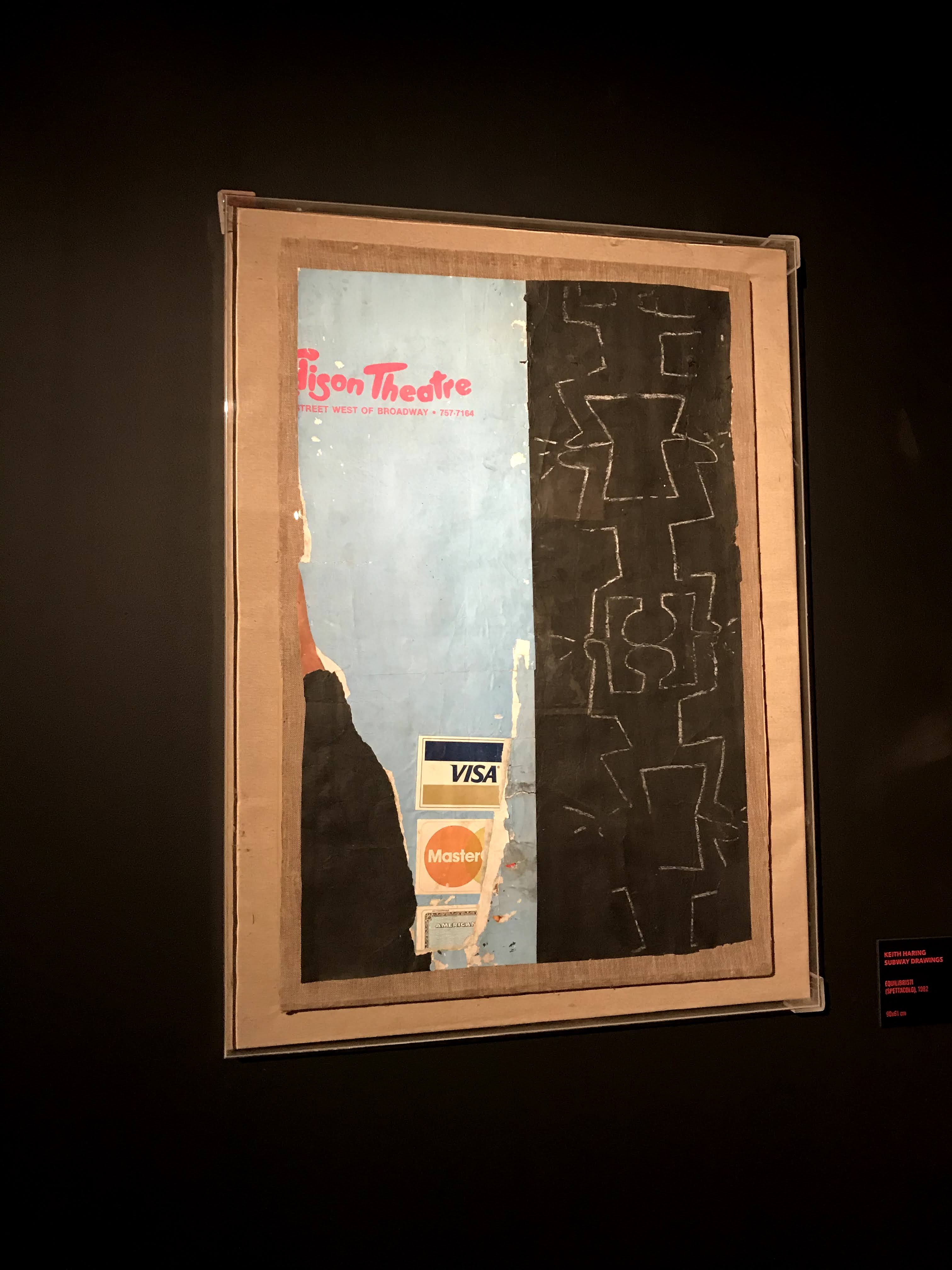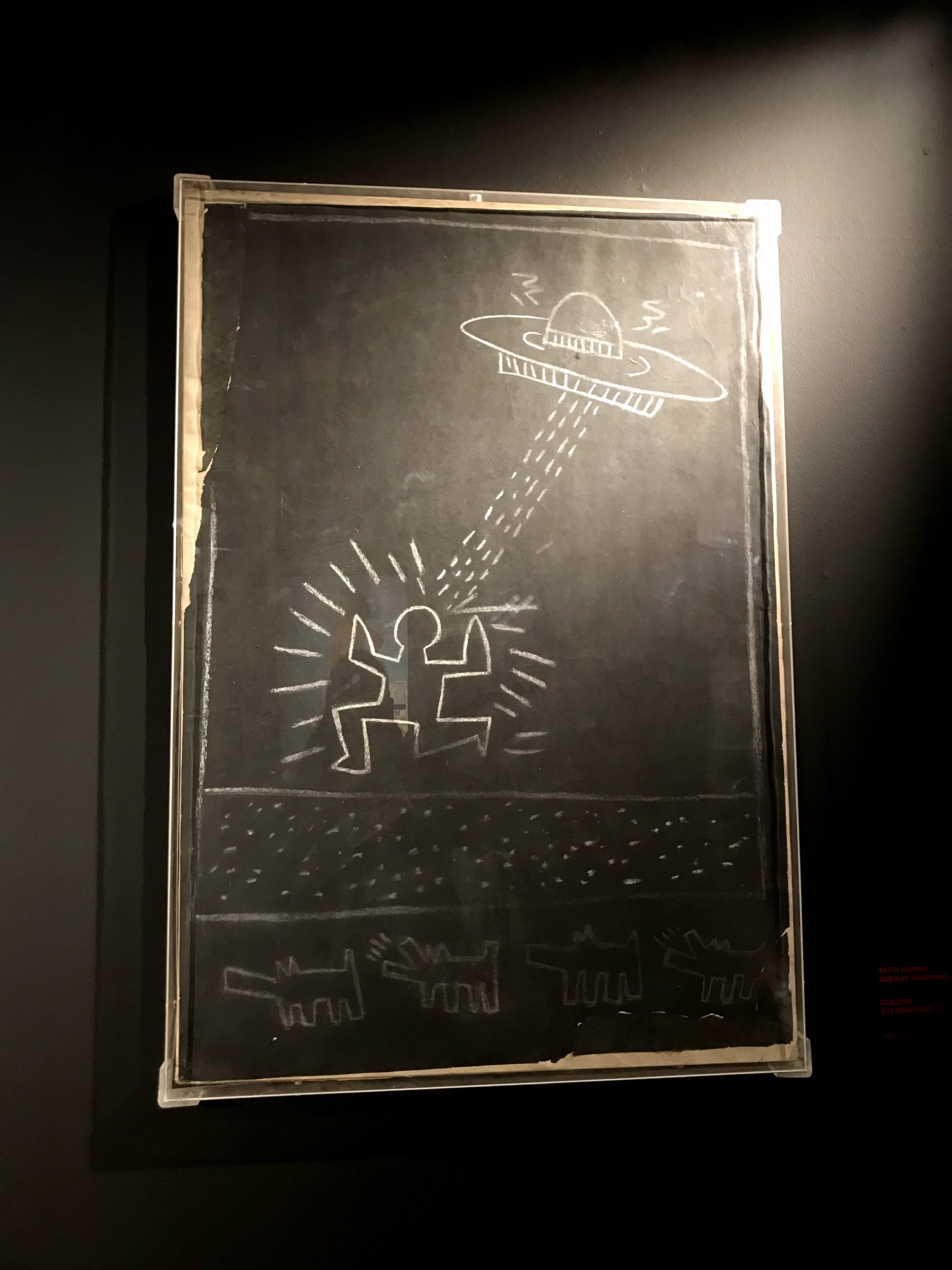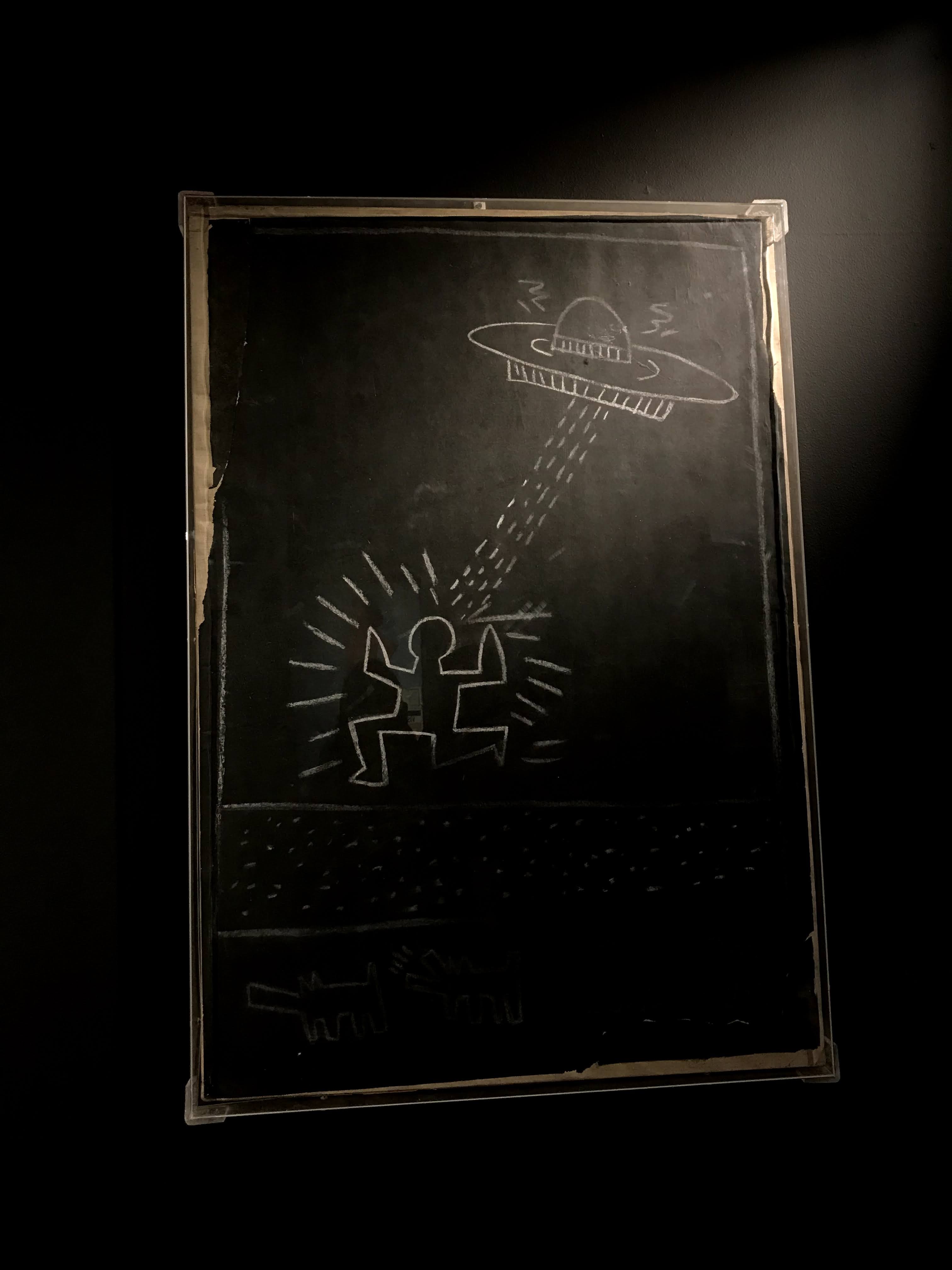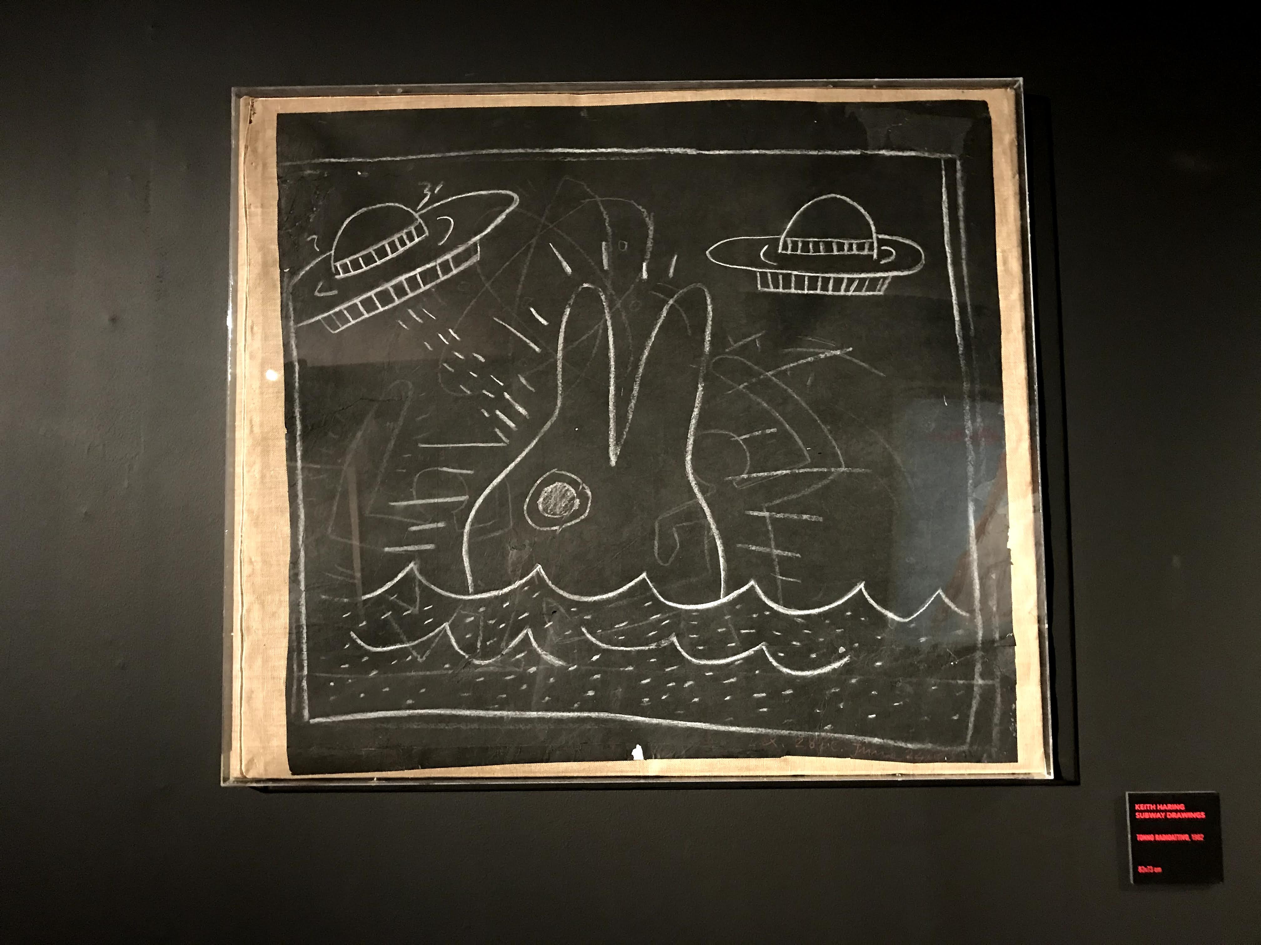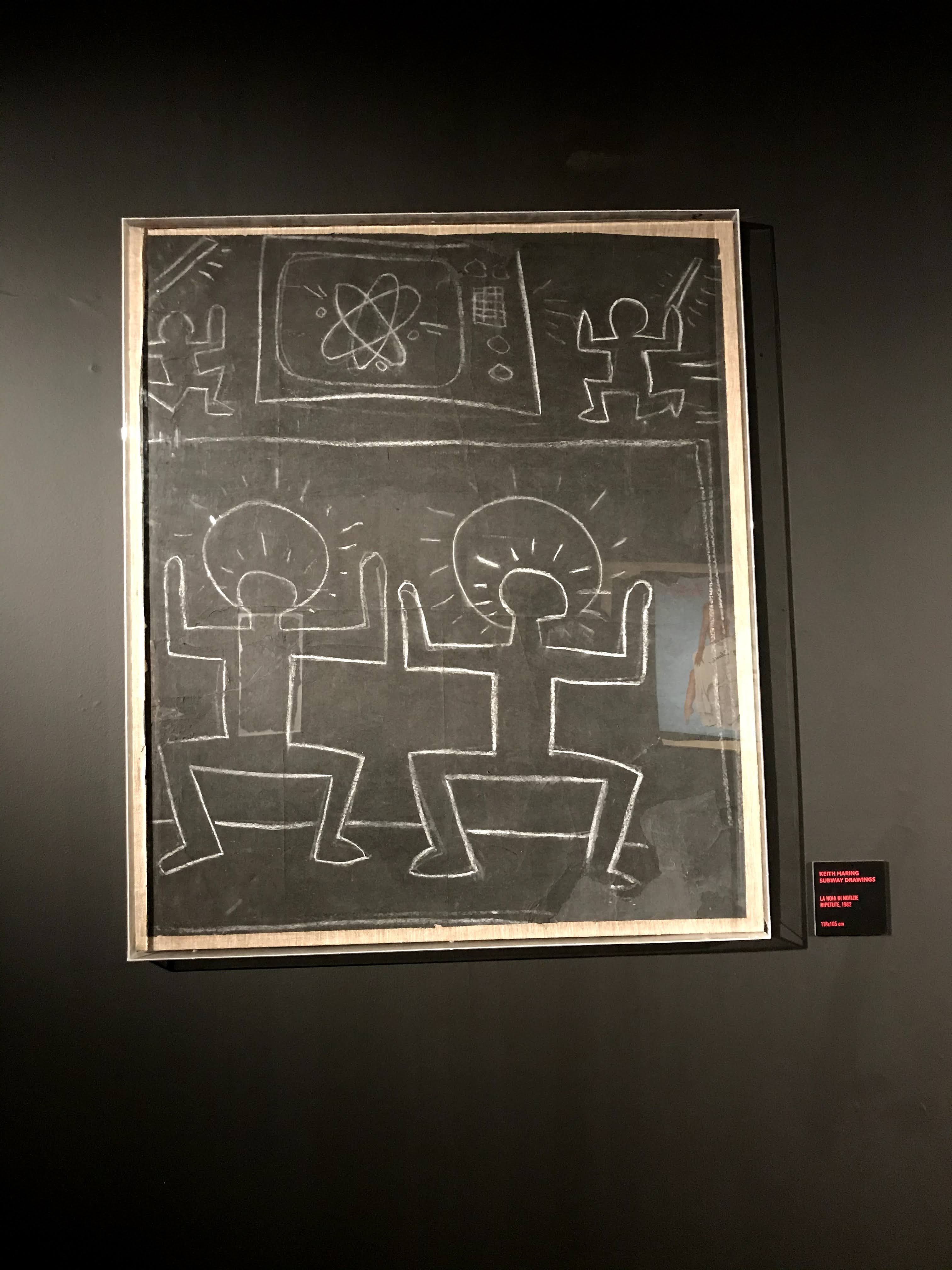 La prima sezione della mostra si concentra sull’iniziale fase dell’artista americano dedicata ai “subway drawings”, ovvero i disegni realizzati con il gessetto bianco sopra i fogli di carta nera della municipalità di New York, che venivano affissi per coprire le pubblicità scadute delle banchine della metropolitana. Già da questa sala si scopre come sia stato Paolo Buggiani a conservare queste opere, che quasi sicuramente senza il suo intervento sarebbero andate perdute. I primi lavori di Haring, infatti, erano ben lontani dal circuito di gallerie e musei, poiché rappresentavano l’essenza genuina della Street Art newyorkese. I “subway drawings” venivano realizzati in rapida sequenza, contro il volere delle autorità e sotto gli occhi complici dei passanti. Questi graffiti sono solo un accenno del grande talento dell’artista, ma riescono a far cogliere all’osservatore l’evoluzione delle figure stilizzate tipiche di Haring.