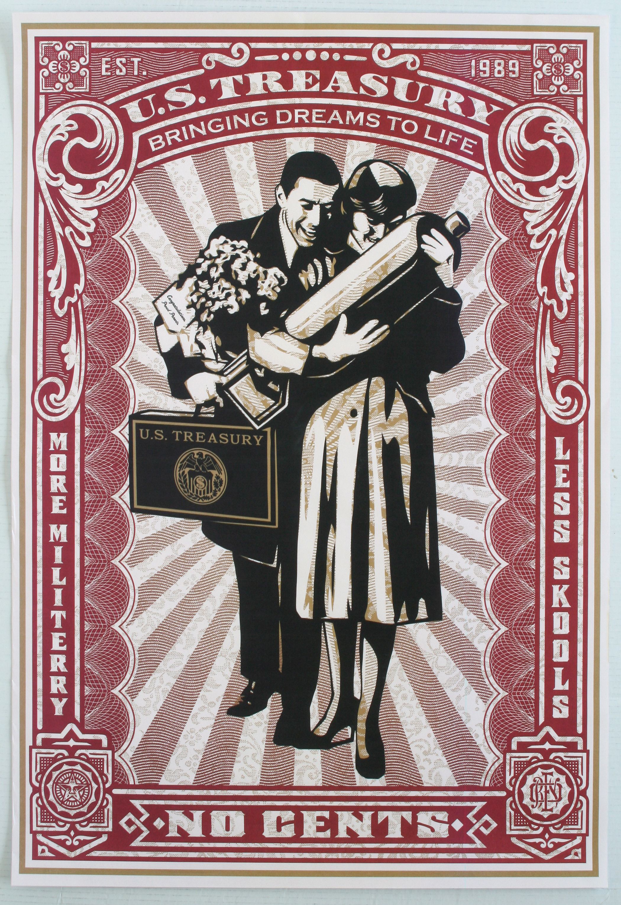 Questa stampa venne concepita durante il secondo mandato di George W. Bush. Nella serigrafia, dal gusto vintage, è raffigurata una coppia che tiene una bomba al posto del bambino. L’ottimismo della coppia è incorniciato da giochi di parole che evidenziano il loro futuro. Una metafora del governo americano che investiva la maggior parte delle sue risorse economiche nelle forze armate invece che nell’istruzione.