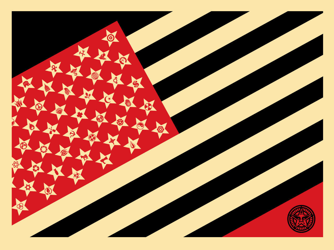 Prima di parlare del caso Hope, poster con soggetto Obama che influenzò la campagna elettorale del 2008, ci soffermiamo sui valori di Shepard Fairey che immortalò nella bandiera americana. Questi lavori sono ispirati a Jasper Jones, esponente del New Dada e primo artista a utilizzare la bandiera americana nell’arte. Shepard Fairey dispone la bandiera trasversalmente e trasforma le stelle, rappresentanti gli stati americani, in simboli in cui l’artista stesso crede fermamente: ambientalismo, pacifismo, rock and roll, proponendo un’interpretazione ed evoluzione di un simbolo univoco.