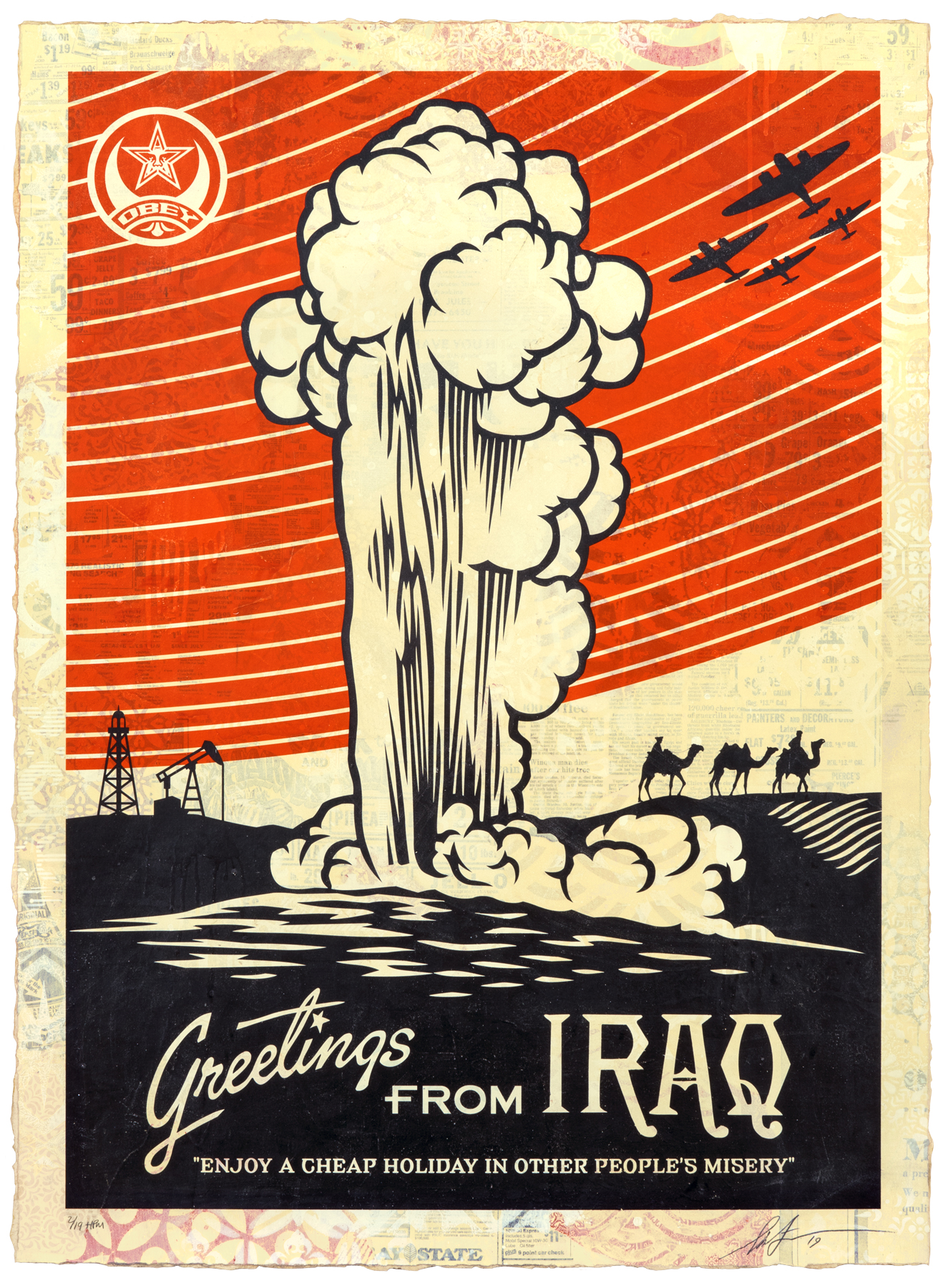 Dopo questa campagna “propagandistica”, cominciò a realizzare dei lavori di critica politica utilizzando immagini storiche. Questo è il caso del poster contro la guerra in Iraq, dove Fairey utilizzò il disegno del poster di Yellowstone Park, un simbolo e una metafora nella quale la gente potesse facilmente riconoscersi. Utilizzò qualcosa di familiare, cambiando completamente lo scenario, facendo dell’arte visiva uno strumento per illuminare le persone.