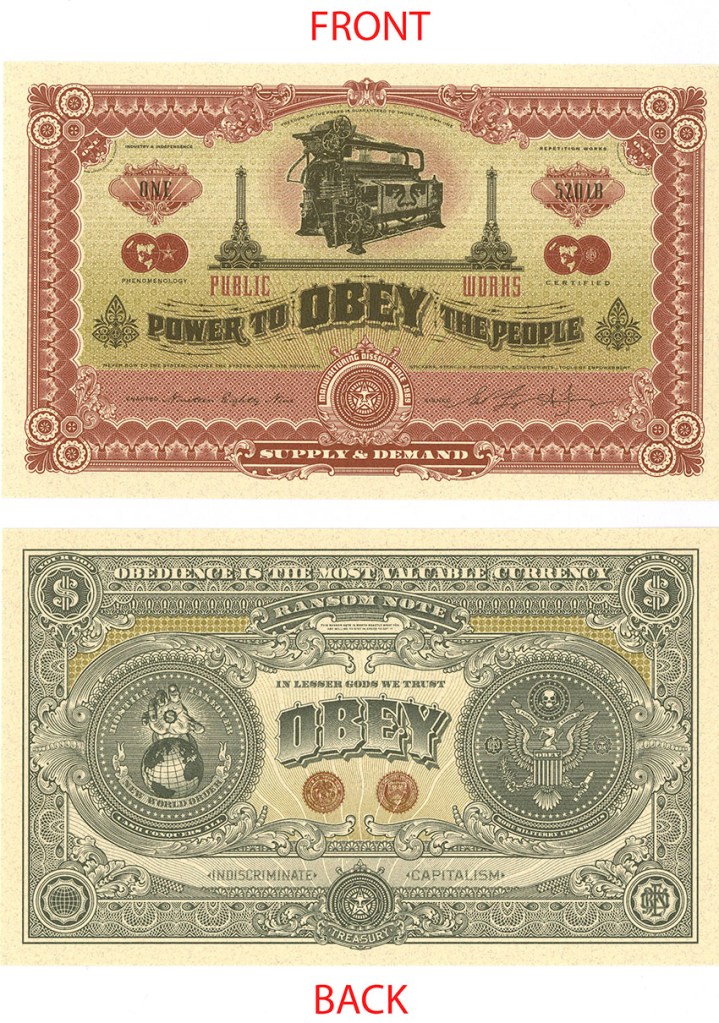 Nel 1988 esce il film “They Live”, diretto da John Carpenter, che entrò subito nella cultura underground impressionando molto Shepard Fairey. In una scena del film, la protagonista indossando degli occhiali da sole scopre il mondo per com’è: in bianco e nero, le persone sono alieni con l’aspetto di scheletri, ma soprattutto riesce a vedere i messaggi subliminali dei media obey, consume, reproduce, and conform. La parola Obey colpisce a tal punto Shepard Fairey che decide di utilizzarlo nei suoi lavori, creando degli stickers propagandistci riutilizzando la faccia di Andre the Giant.
