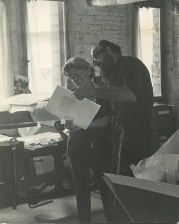 Emilio Vedova, Combattimento, olio su tela, 1948 (esposto alla 24. Biennale d’arte); Foto che ritrae Giuseppe Marchiori, Giovanni Comisso, Peggy Guggenheim, Emilio Vedova e Giuseppe Santomaso sullo scalone del Comune di Venezia il giorno in cui viene conferita a Peggy la cittadinanza onoraria di Venezia, 5 febbraio 1962.