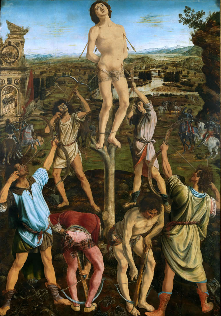 La figura di San Sebastiano è stata nei secoli un’icona rappresentativa del mondo cristiano, apprezzata fonte di ispirazione per vari artisti che lo hanno ritratto in atteggiamenti, fattezze e pose diverse: dalla più languida e femminea di Piero del Pollaio, alla più virile e mascolina del Mantegna.