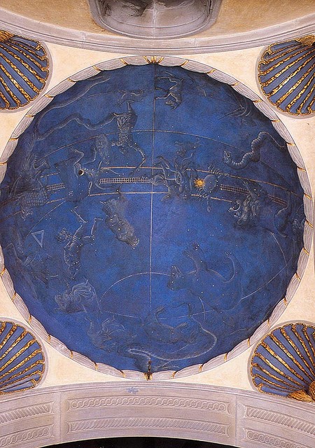Dal Quattrocento i cicli astrologici entrano nella sfera artistica in maniera ufficiale, grazie a una delle più grandi famiglie dell’epoca: i Medici. Con Cosimo il Vecchio, iniziò una vera e propria tradizione di committenze di opere con all’interno temi astrologici. Il primo oroscopo dipinto, infatti, risale al 1442, nella Cupolina della sagrestia vecchia, realizzato da Giuliano D’ Arrigo a Firenze sotto la committenza dello stesso Cosimo il Vecchio. Nell’affresco si notano in maniera nitida i segni zodiacali, il sole, i meridiani e il Polo Nord e la loro posizione non è casuale, anzi. Dopo i restauri eseguiti negli anni ‘80, infatti, si è arrivati a determinare che è raffigurato il cielo del giorno del 4 luglio 1442. L’artista ha eseguito l’affresco utilizzando la tecnica della pittura a secco su fondo di azzurrite con gli elementi astronomici disegnati a foglia, sostenuto dall’aiuto dell’astronomo Paolo Dal Pozzo Toscanelli, amico della famiglia committente. Grazie a uno strumento inventato e costruito da Filippo Brunelleschi appositamente per l’astronomo e posto nella cupola di Santa Maria del Fiore, Toscanelli è riuscito a misurare lo spostamento impalpabile e molto lento dello zodiaco e a riproporlo a D’Arrigo per la cupola della chiesa di San Lorenzo.