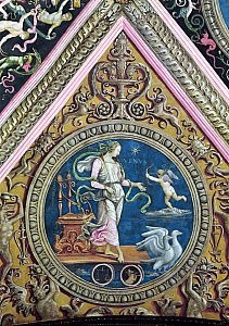 A Roma, negli stessi anni si sta realizzando uno dei più importanti e cicli astrologici del secolo: quello dipinto dal Pinturicchio nella Sala delle Sibille nell’Appartamento Borgia. Sotto la committenza del papa Alessandro VI, viene realizzata in un lasso di tempo molto breve, tra il 1492 e 1494, confermando la fama e la bravura del pittore, che utilizza una tecnica mista tra affresco e una pittura più rapida a secco. Il papa ha voluto il complesso decorativo a seguito del suo interesse e passione nei confronti della cultura ermetica e fece rappresentare sé stesso nel trionfo di Venere, in cui il carro della dea viene tirato non da colombe, come da tradizione, ma da buoi, animali simbolo dei Borgia. Sono raffigurati i figli dei Pianeti sulla volta, in scomparti trapezoidali, sovrastati dal trionfo del pianeta, personificato da un Dio, affiancato da tutti i segni zodiacali con, in primo piano, gruppi di uomini intenti a svolgere delle attività secondo l’influsso di quel determinato astro.