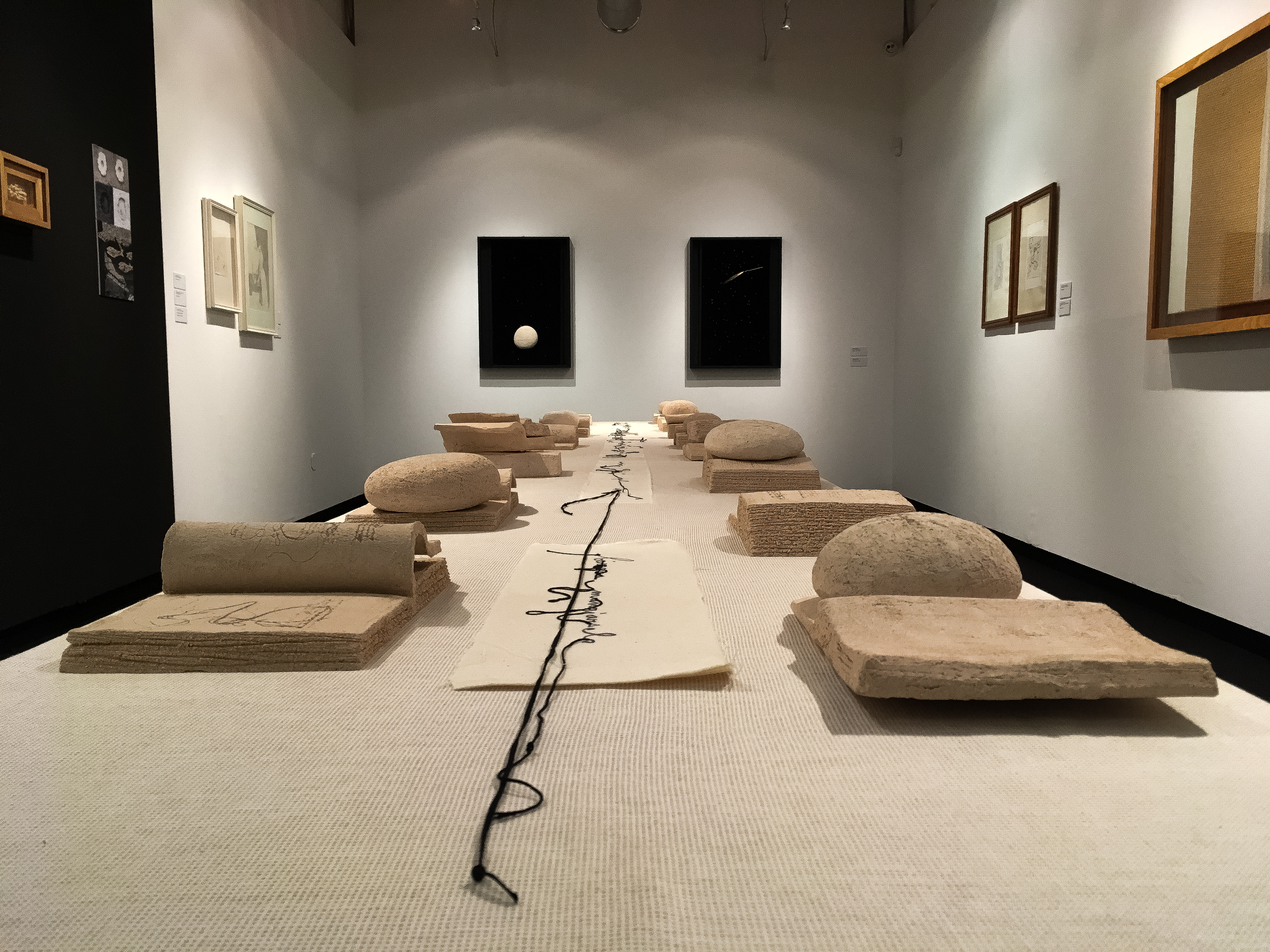 Tutte le sue opere più celebri condividono un elemento comune: il filo, quello dei telai su cui cucivano le donne che hanno popolato la sua infanzia in Sardegna, ma anche quello della leggenda e il correlativo oggettivo delle connessioni e relazioni tra le persone. Gli stessi Telai, in un inedito intreccio di pittura e scultura, passando sotto le sue mani diventano opere negli anni ’60, opere che parlano di una quotidianità frugale che racchiude in sé qualcosa di eterno, la stessa quotidianità di cui parla anche la preparazione del pane raffigurata in disegni di quasi un ventennio prima. Maria Lai indaga i riti del passato, del suo passato, per arrivare al nocciolo duro della vita stessa, a quella verità che rimane sempre tale in ogni luogo e in ogni tempo per ogni uomo.