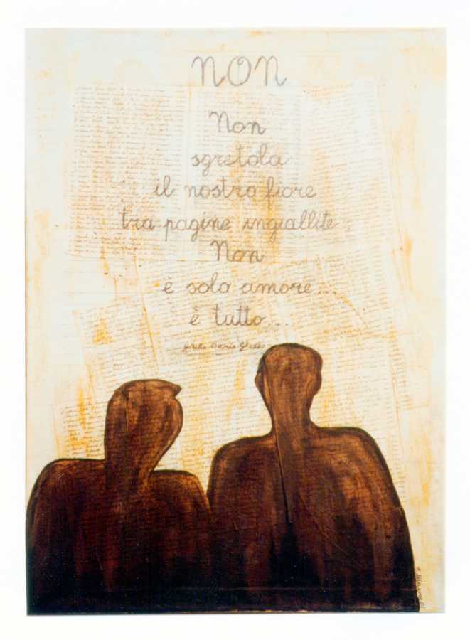 Fig. 1 Il maestro Fernando Masone che fa la carta; fig. 2 Interno dell’atelier; fig. 3 Fernando Masone, Non, collage e olio su tela, cm. 70×100, 2001; fig. 4 Fernando Masone, Volume Mobile I, diam. mm 700×500, 2011.