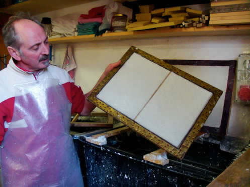 Qui gli ospiti sono sempre i benvenuti, Fernando ci offre anche un bicchiere di buon vino a produzione biologica e dei cantucci. Ma la sua ospitalità, ovviamente, non è l’unico motivo per recarsi da lui: talvolta infatti si possono trovare opere esposte di vari artisti, realizzate esclusivamente su carta fatta a mano. Se si va in dei giorni fortunati, come il nostro, si riesce anche a vederlo all’opera nel fare la carta in laboratorio, nelle sue tinozze che lo accompagnano da anni in quest’attività.