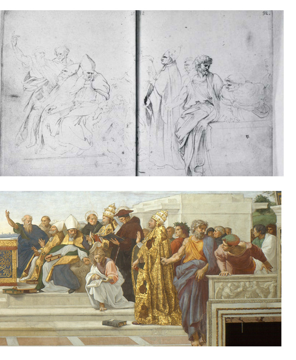 Nonostante Tiziano sia l’artista predominante, Van Dyck ha rivolto la sua attenzione anche ad altri maestri veneti, come Giorgione e Veronese, ma anche a uno dei maggiori pittori di tutto il Cinquecento: Raffaello Sanzio. Una delle pagine del taccuino mostra una copia tratta dalla parte inferiore dell’affresco della Disputa sul Sacramento, nelle Stanze Vaticane: