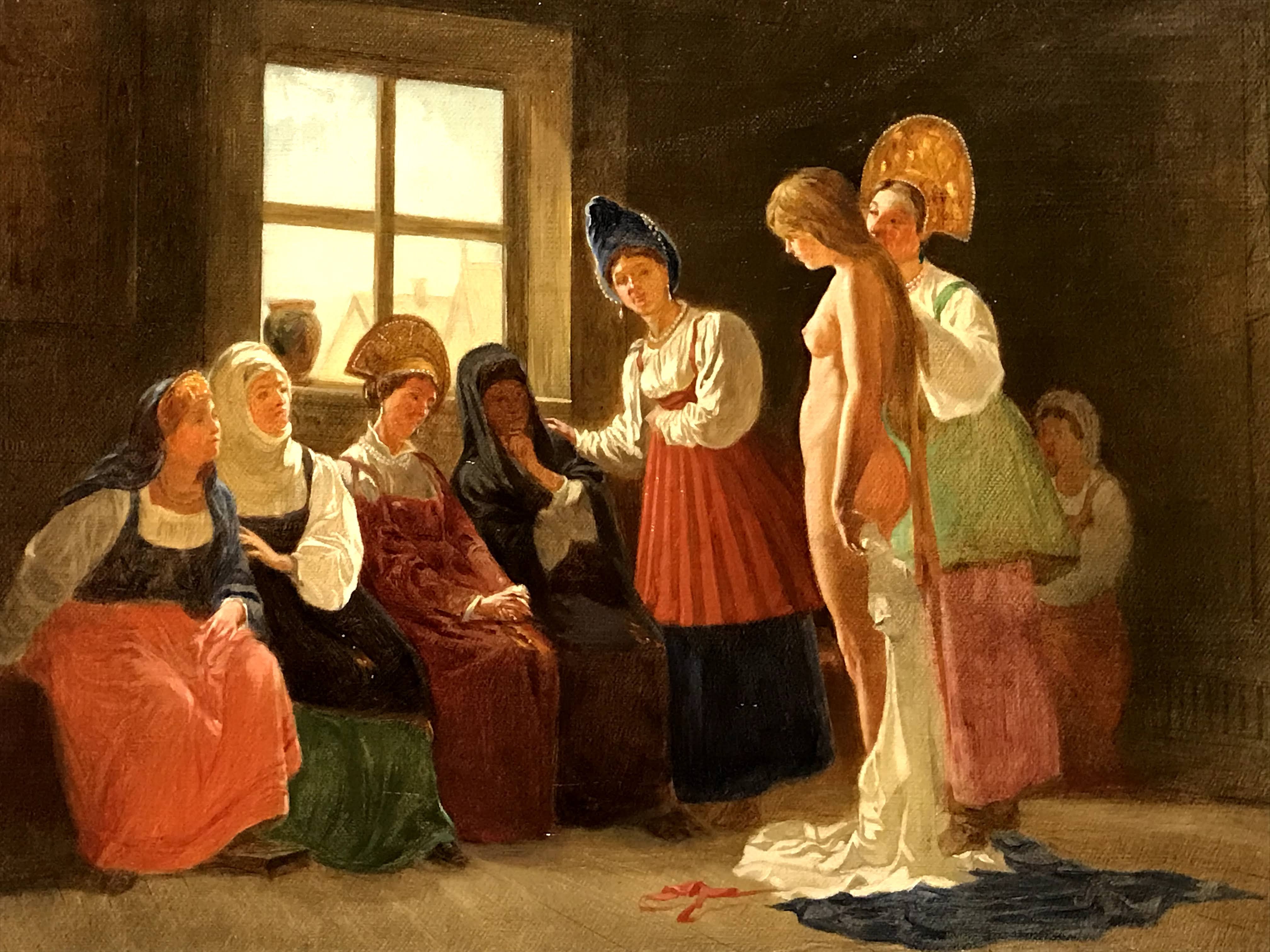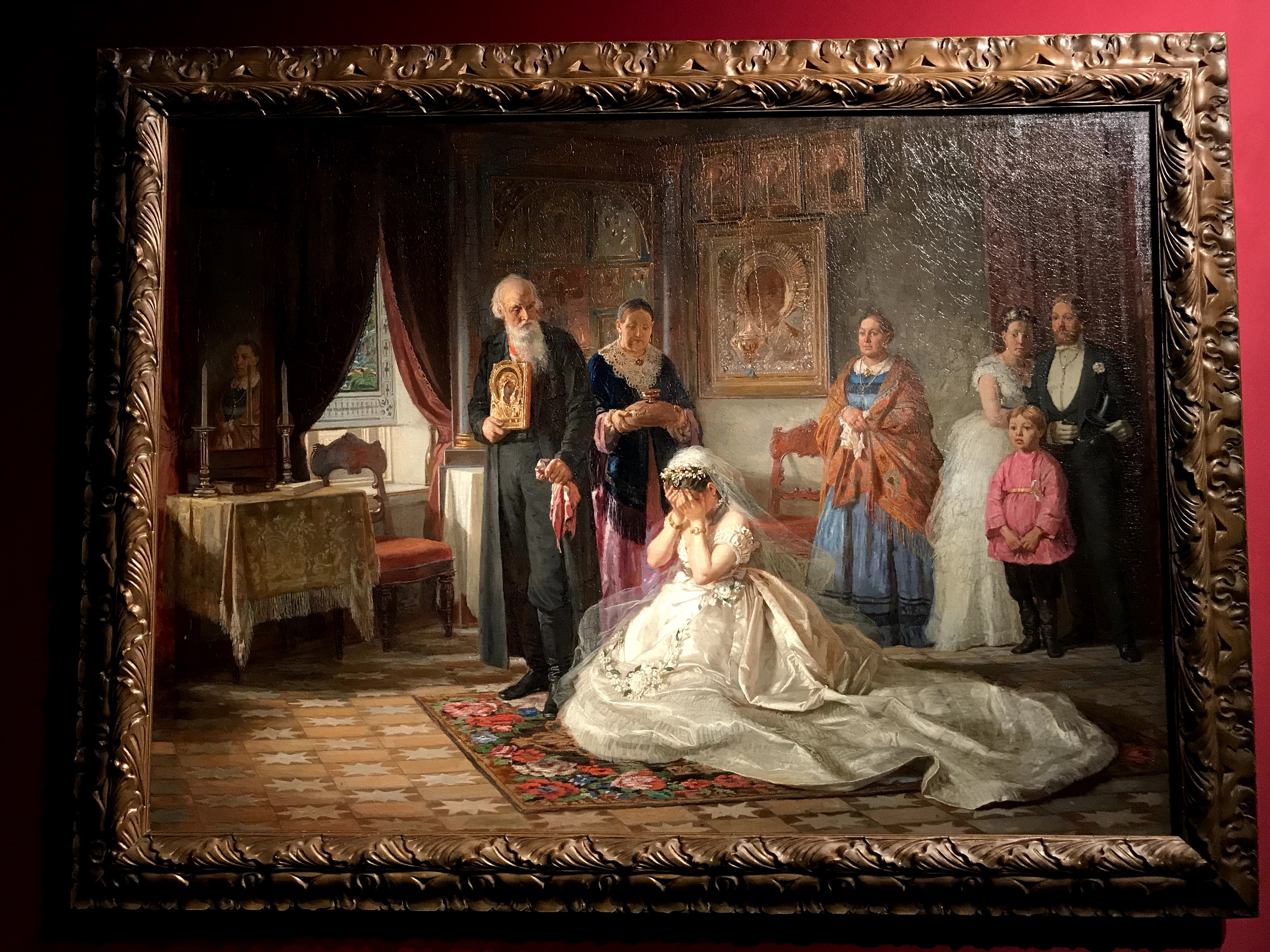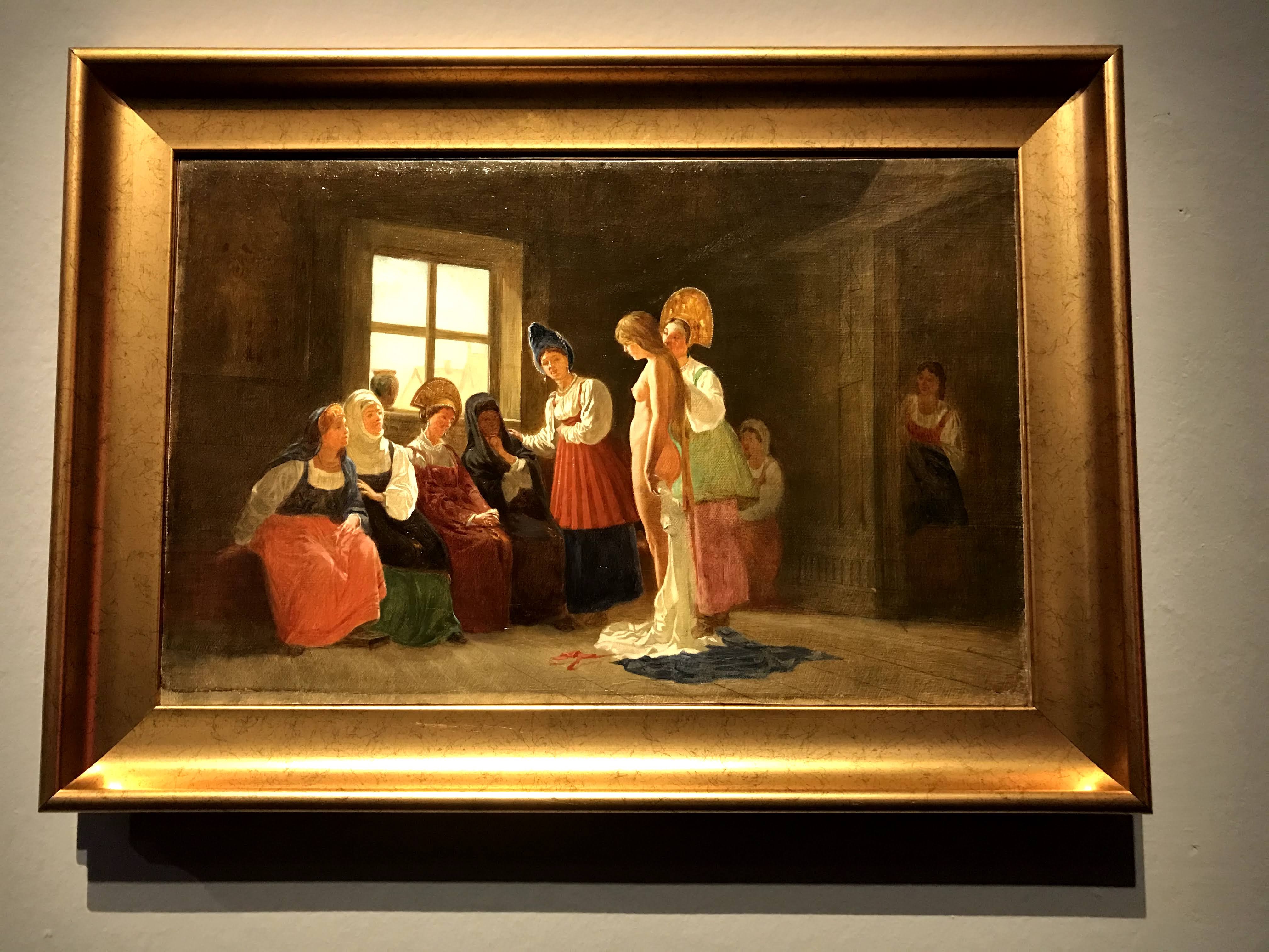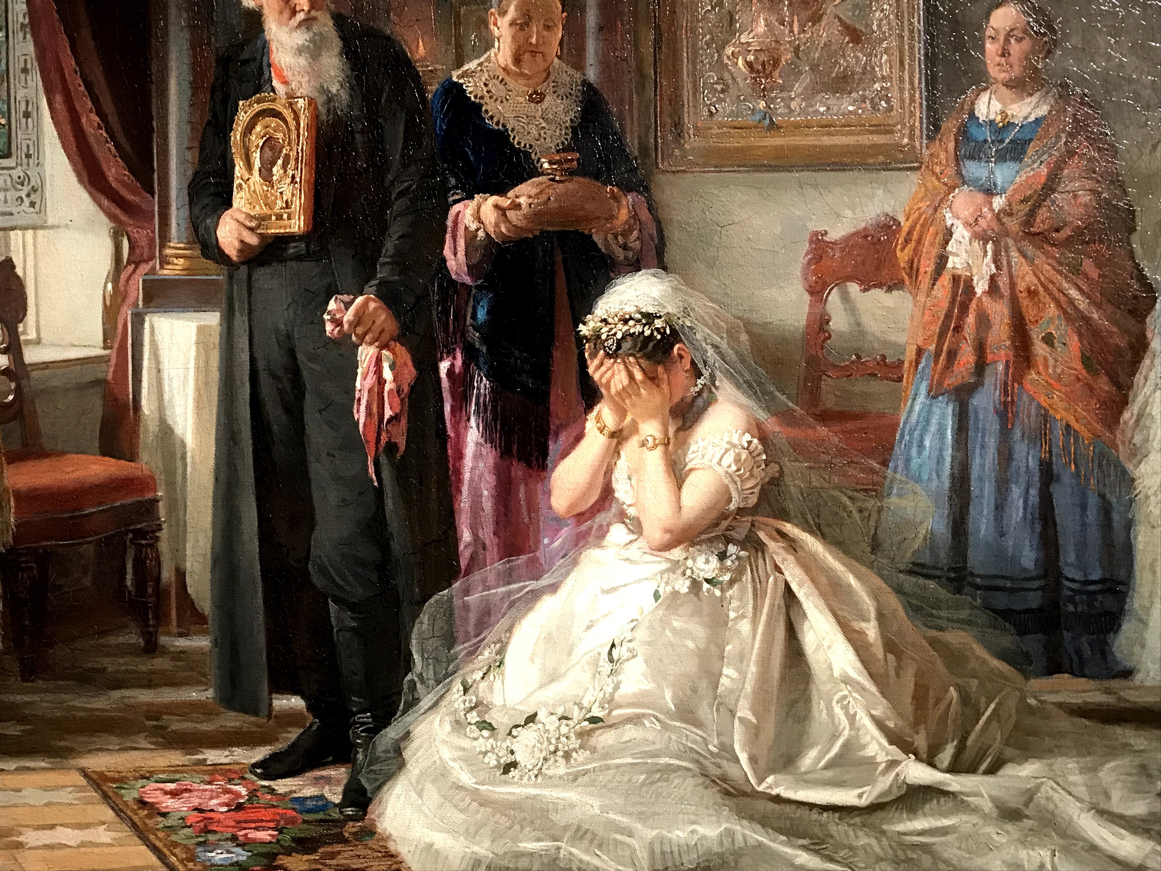Le due sezioni che mi hanno estremante colpita sono “la famiglia”, dedicata ai rituali e convenzioni russe prima del matrimonio, e la seconda “le madri” che sviluppa invece la dimensione d’amore delle madri verso i loro bambini. La sezione “la famiglia” mostra come ancora all’inizio del ‘900 in Russia molte donne erano subordinate a rigide norme patriarcali, basate sul rispetto dei più anziani e in particolare degli uomini fino alla più rigorosa e arcaica usanza che voleva le donne “pure” fino al matrimonio. Queste tematiche sono state spesso analizzate nella loro drammaticità dai più celebri scrittori della letteratura russa come Aleksandr Ostrovskij, Lev Tolstoj e Fëdor Destoevskij. In questa sezione le opere presenti hanno lo scopo di denunciare questo sistema patriarcale particolarmente sessista e ingiusto. Nell’opera “il suocero” di Vladimir Makovskij viene rappresentata una giovane sposa molestata dal padre di suo marito, nello sguardo della giovane oltre alla paura possiamo ammirare lo sconforto dovuto all’impossibilità di ribellarsi. Nell’opera “Prima dell’incoronazione del matrimonio” di Firs Zuravlëv mostra tutta la disperazione della giovane sposa destinata a un vecchio marito per questioni di interesse. L’opera più toccante a mio avviso è la “Presentazione della promessa sposa” di Grigorij Mjasoedov che fissa un momento umiliante nella preparazione dell’evento: la fidanzata nuda viene osservata scrupolosamente dai futuri partenti, il tutto avviene all’interno della casa del fidanzato. La figura della giovane sposa si staglia al centro della scena, il suo candore è sinonimo di purezza e nobiltà d’animo, il quale stride fortemente rispetto ai colori spenti delle vecchie pettegole, che la scrutano severamente. È interessante osservare che in questo quadro le ragazze giovani o hanno colori candidi o colori estremamente caldi, sintomo della loro giovinezza e gentilezza, mentre al contrario le anziane hanno colori tetri e scuri, proprio a indicare la loro corruzione e accettazione di un sistema valoriale sbagliato.