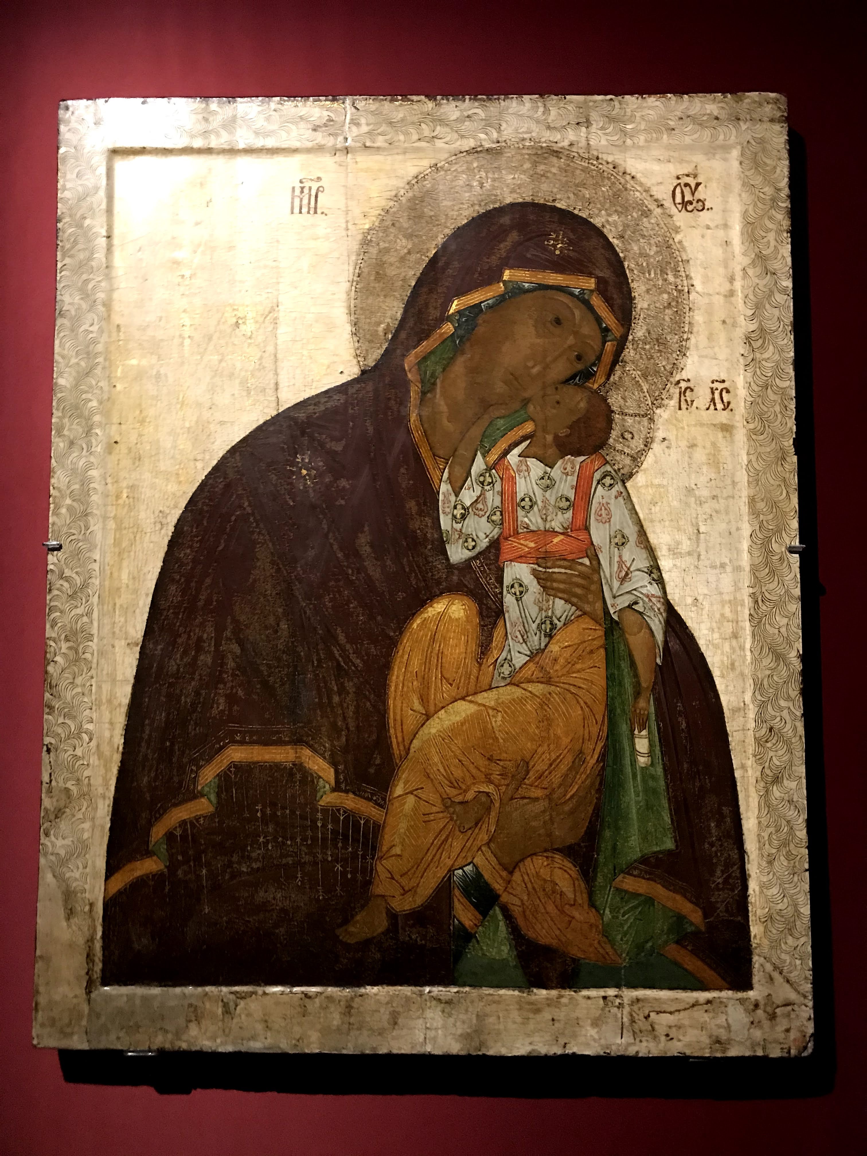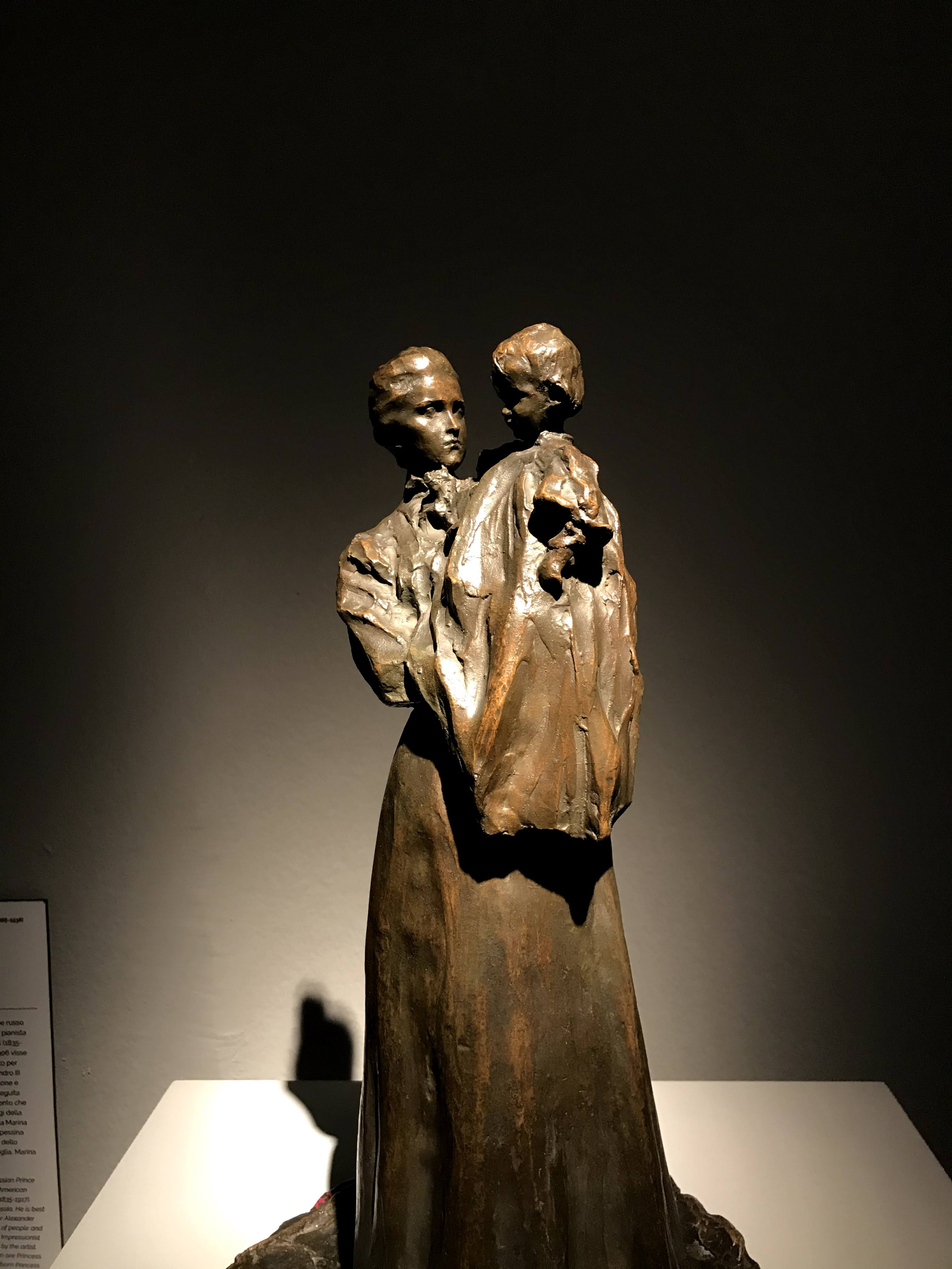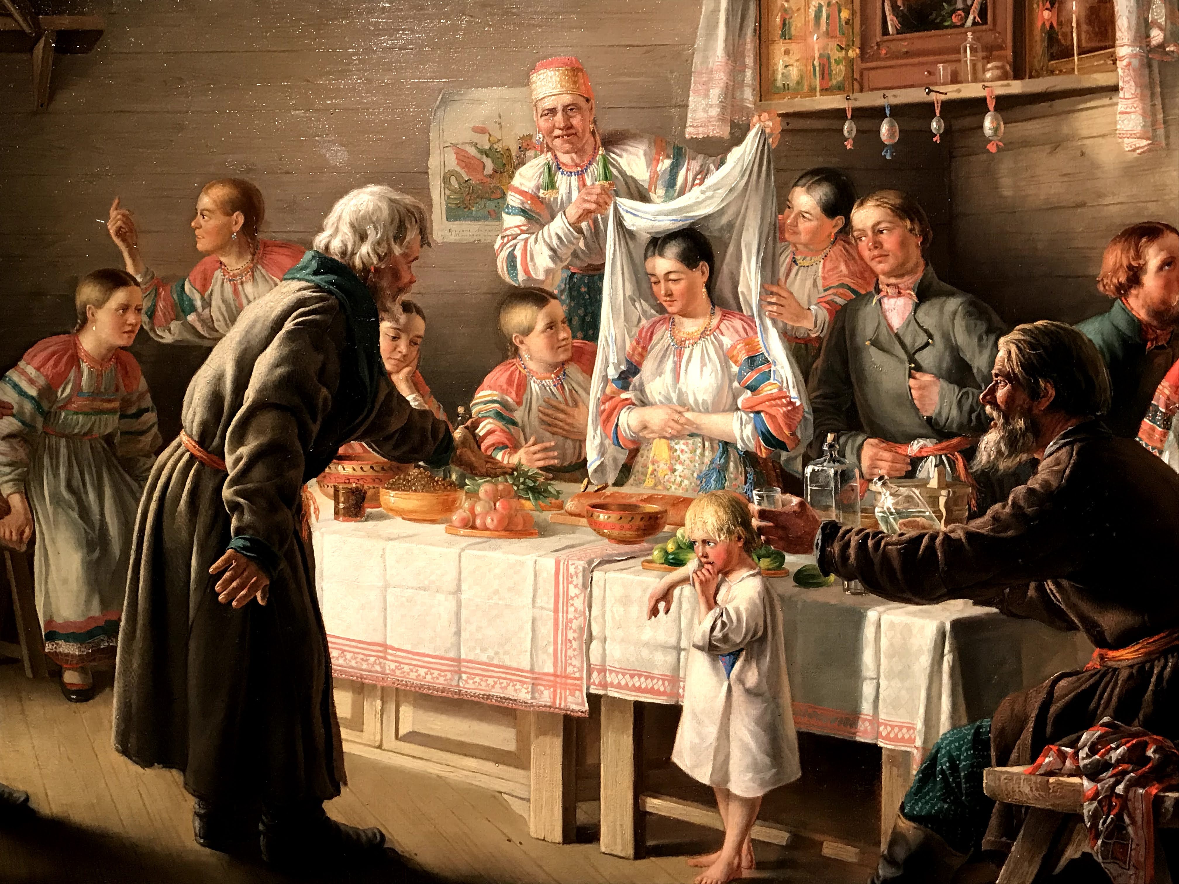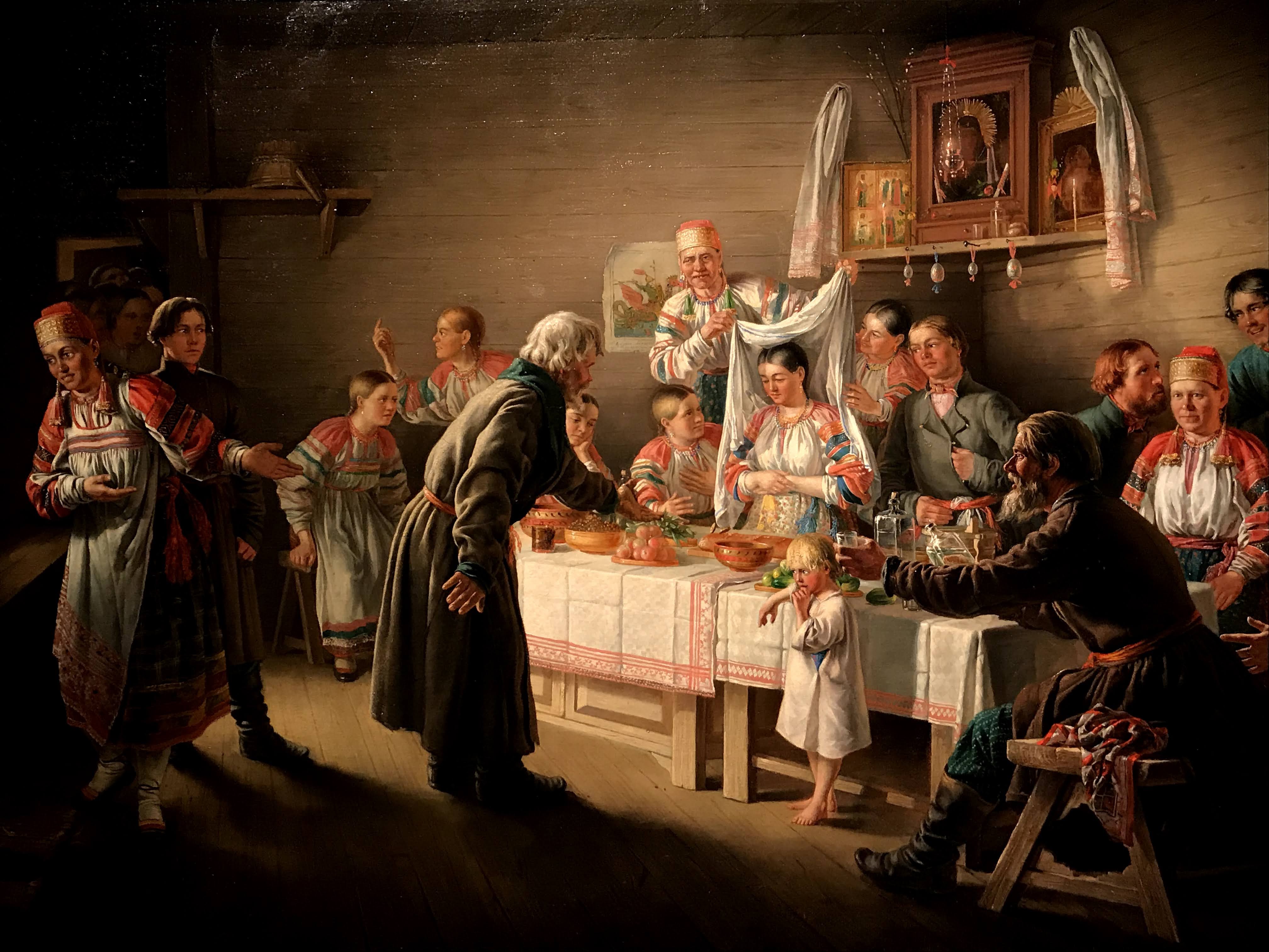 Le due sezioni che mi hanno estremante colpita sono “la famiglia”, dedicata ai rituali e convenzioni russe prima del matrimonio, e la seconda “le madri” che sviluppa invece la dimensione d’amore delle madri verso i loro bambini. La sezione “la famiglia” mostra come ancora all’inizio del ‘900 in Russia molte donne erano subordinate a rigide norme patriarcali, basate sul rispetto dei più anziani e in particolare degli uomini fino alla più rigorosa e arcaica usanza che voleva le donne “pure” fino al matrimonio. Queste tematiche sono state spesso analizzate nella loro drammaticità dai più celebri scrittori della letteratura russa come Aleksandr Ostrovskij, Lev Tolstoj e Fëdor Destoevskij. In questa sezione le opere presenti hanno lo scopo di denunciare questo sistema patriarcale particolarmente sessista e ingiusto. Nell’opera “il suocero” di Vladimir Makovskij viene rappresentata una giovane sposa molestata dal padre di suo marito, nello sguardo della giovane oltre alla paura possiamo ammirare lo sconforto dovuto all’impossibilità di ribellarsi. Nell’opera “Prima dell’incoronazione del matrimonio” di Firs Zuravlëv mostra tutta la disperazione della giovane sposa destinata a un vecchio marito per questioni di interesse. L’opera più toccante a mio avviso è la “Presentazione della promessa sposa” di Grigorij Mjasoedov che fissa un momento umiliante nella preparazione dell’evento: la fidanzata nuda viene osservata scrupolosamente dai futuri partenti, il tutto avviene all’interno della casa del fidanzato. La figura della giovane sposa si staglia al centro della scena, il suo candore è sinonimo di purezza e nobiltà d’animo, il quale stride fortemente rispetto ai colori spenti delle vecchie pettegole, che la scrutano severamente. È interessante osservare che in questo quadro le ragazze giovani o hanno colori candidi o colori estremamente caldi, sintomo della loro giovinezza e gentilezza, mentre al contrario le anziane hanno colori tetri e scuri, proprio a indicare la loro corruzione e accettazione di un sistema valoriale sbagliato.