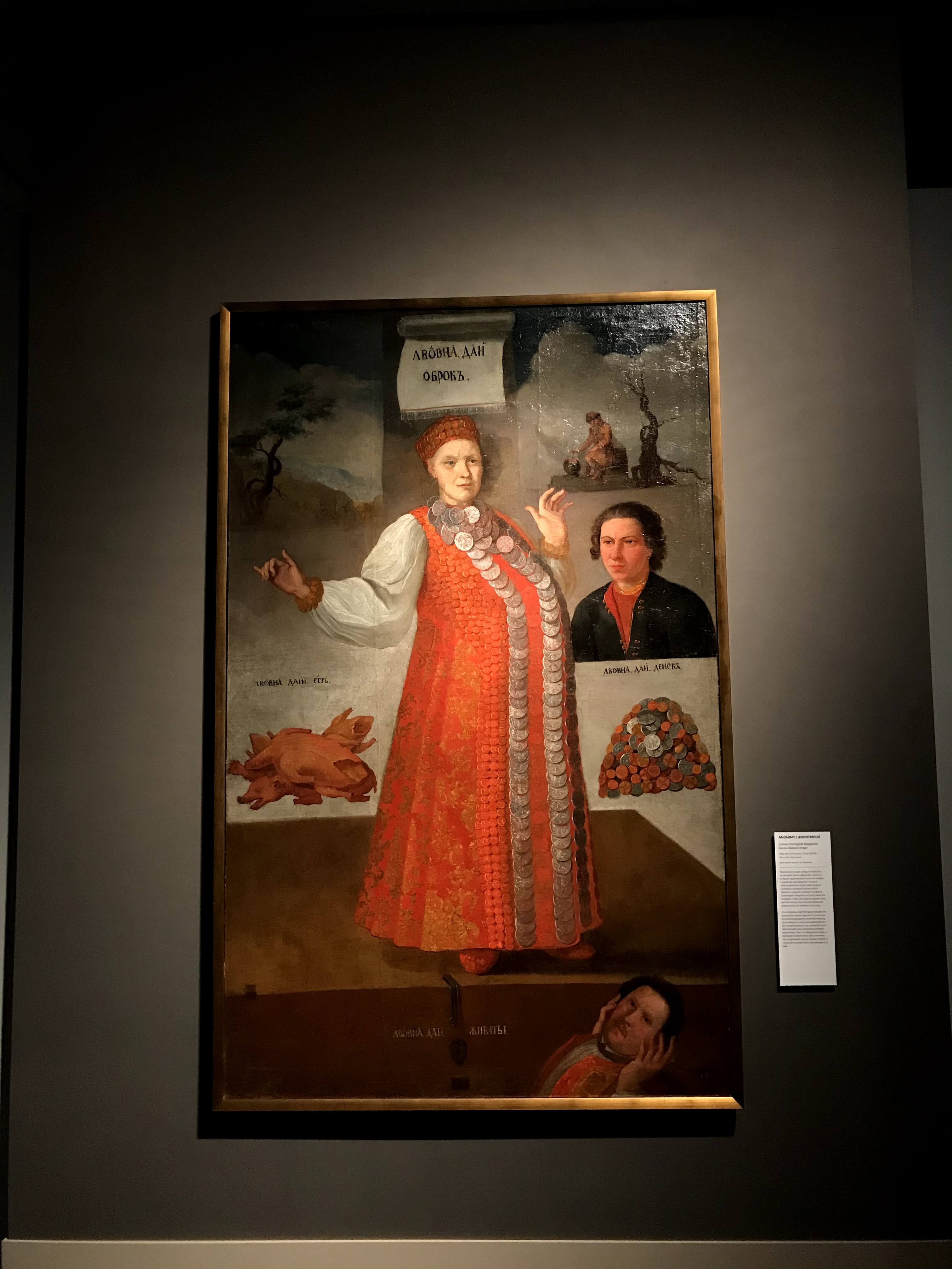 Nella prima parte della mostra, suddivisa in ben 8 sezioni, viene analizzata la figura femminile russa e come nel tempo sia cambiato il suo ruolo all’interno della società. Se le prime immagini femminili sono relegate soltanto all’iconografia di sante e madonne, in seguito si sviluppa il tema delle imperatrici e del ruolo politico (alcune volte prominente) delle figure femminili all’interno della corte zarista. Se da un lato si enfatizza la scaltrezza e la tenacia delle imperatrici nello sfarzo dei loro palazzi, dall’altro, nello stesso periodo, molti artisti pongono la loro attenzione attorno al tema del realismo, in particolare si dedicano alla denuncia sociale delle condizioni di miseria in cui la gran parte della popolazione russa versava. In questo filone artistico emerge la situazione di povertà e soprusi in cui gran parte delle contadine e delle operaie sottostavano, costrette la maggior parte delle volte a lavorare di più rispetto agli uomini per ottenere minor ricompensi. Proseguendo poi la mostra, si accede al filone dedicato alle donne moderne all‘interno della società russa alla fine dell’ottocento, in questa sezione si può osservare come le donne borghesi si vogliano emancipare, sono rappresentate come fiere e colte, spesso sono accompagnate da strumenti musicali o da libri, in alcuni casi hanno uno sguardo diretto verso l’osservatore oppure sono intente a pensare e riflettere su quanto hanno appena letto, oppure sugli avvenimenti della loro vita.
