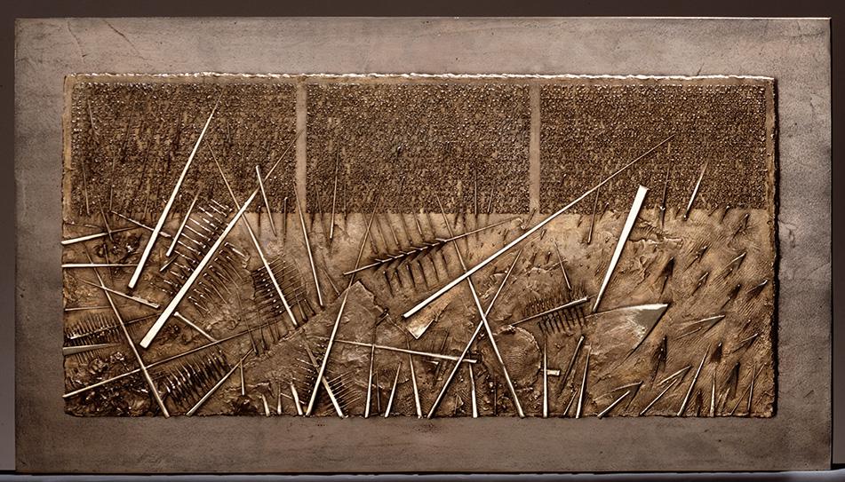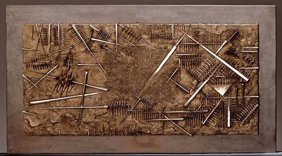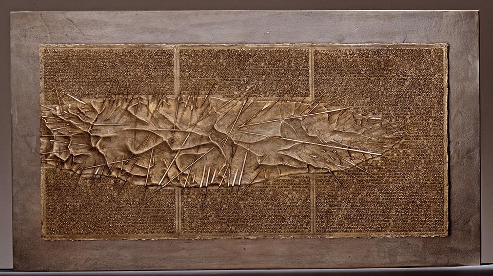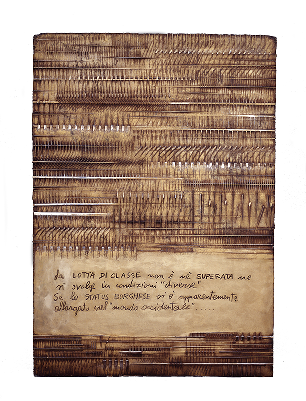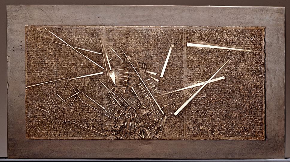 L’uso della scrittura è primario nella serie L’Arte dell’uomo primordiale di Emilio Villa; le lastre bronzee sono la riproduzione delle calcografie realizzate per l’omonimo volume. L’artista non è la prima volta che collabora con degli scrittori, come Sette Poesie di Guido Balla, volume esposto alla mostra.
