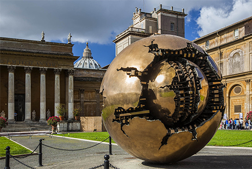 Le opere di Pomodoro sono note a tutti, anche da chi non è un amante dell’arte contemporanea; infatti molte sono le sculture sparse nelle piazze di tutto il mondo, fra cui la Sfera situata nel Cortile della Pigna dei Musei Vaticani e l’imponente Novecento posto al centro della rotonda dell’Eur. Lo scultore, di fama internazionale, nasce a Montefeltro nel 1926 e, dopo essersi formato a Pesaro, inizia il suo percorso artistico nel secondo dopoguerra a Milano dove vive e lavora. Da subito la componente grafica delle sue sculture lo distingue e fa emergere la sua produzione che andrà a definirsi meglio negli anni Sessanta, quando comincia a unire la componente grafica a quella geometrica. Le sue opere, rigorosamente in bronzo, spesso lucidato, sono sfere, coni; superfici “semplici” dalle quali emerge la complessità del loro interno, fatto di segni, di scritte, di impronte e altre forme geometriche; degli ingranaggi irregolari e composti che squarciano la superficie pulita, lucida e regolare del loro contenitore.