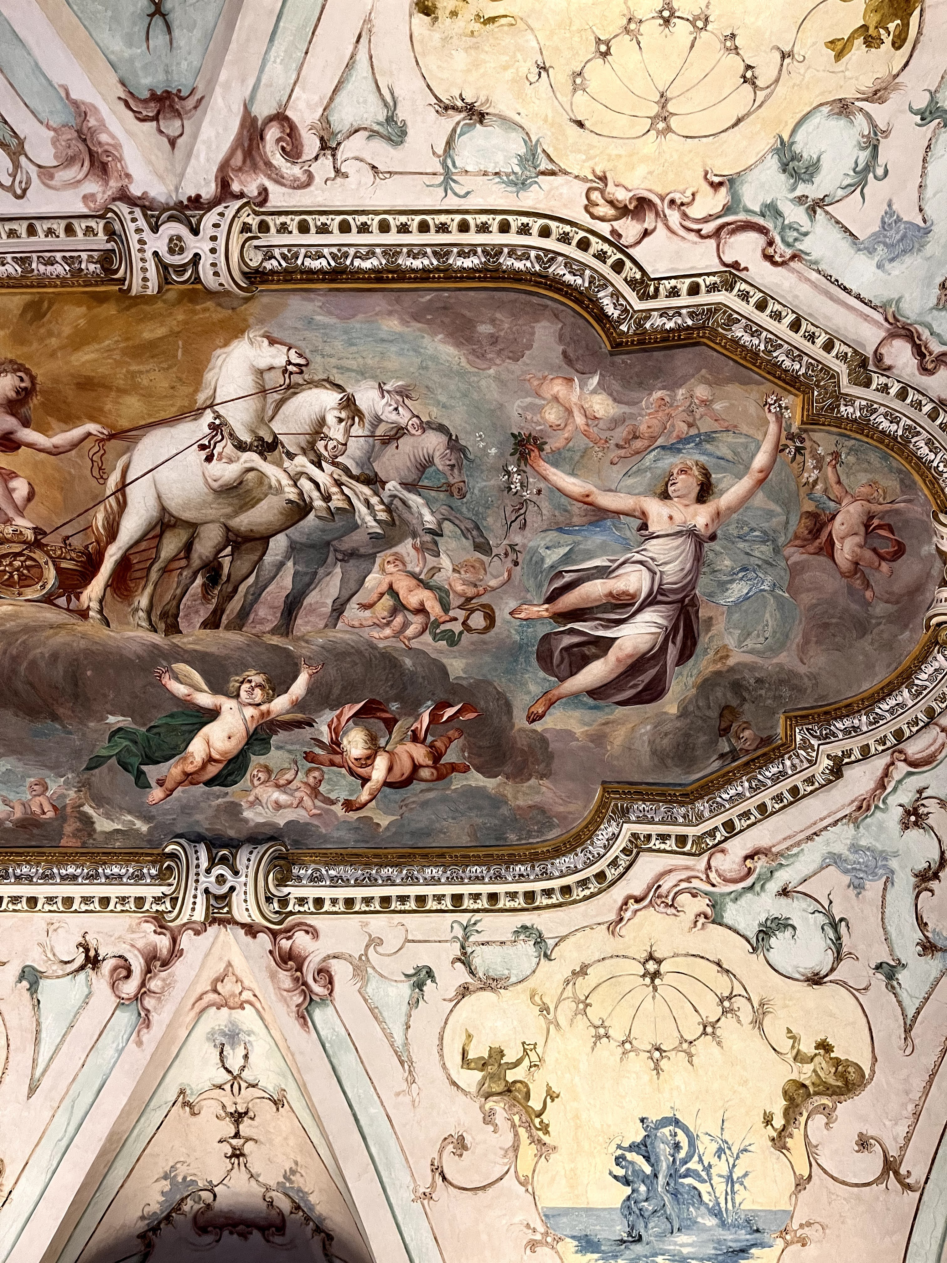 La “Sala Aurora” costituisce l’ambiente di maggior rappresentanza del piano terra, tant’è che comunica direttamente con il cortile ed il Giardino, permettendone un accesso diretto. Immediata è la sensazione di grande luminosità di questo splendido ambiente grazie alle quattro grandi finestre e alle due porte finestra e ciò indica quanto sia significativo il rapporto fra interno ed esterno. A caratterizzare l’ambiente è il grande affresco centrale dove ritroviamo vari personaggi: primo fra tutti Minerva, che tiene per l’ascella un personaggio biondo, identificabile con il ritratto di Giulio II, figlio terzogenito e unico maschio di Bartolomeo III. All’epoca dell’affresco, attorno 1664, Giulio II aveva appena terminato gli studi giuridici; per questo Minerva, la dea della Sapienza, lo solleva fisicamente, metafora della cultura che eleva l’uomo facendolo crescere. Allo stesso tempo Minerva solleva il figlio di Bartolomeo per avvicinarlo al carro del Sole, formula simbolica per augurargli una carriera luminosa ed elevata, peccato che la sorte di Giulio II sarà ben diversa in quanto morirà poco dopo la realizzazione dell’affresco. C’è un ulteriore particolare decisamente significativo: il giovane Giulio tiene nella mano destra una fiaccola la cui la fiamma è simbolo della Cultura, che Giulio dovrà coltivare, allo stesso tempo è anche attributo di Aurora che la tiene solitamente in mano per “accendere” il giorno. La dea infatti la ritroviamo nel lato sinistro dell’affresco nell’intento di dare inizio alla giornata.