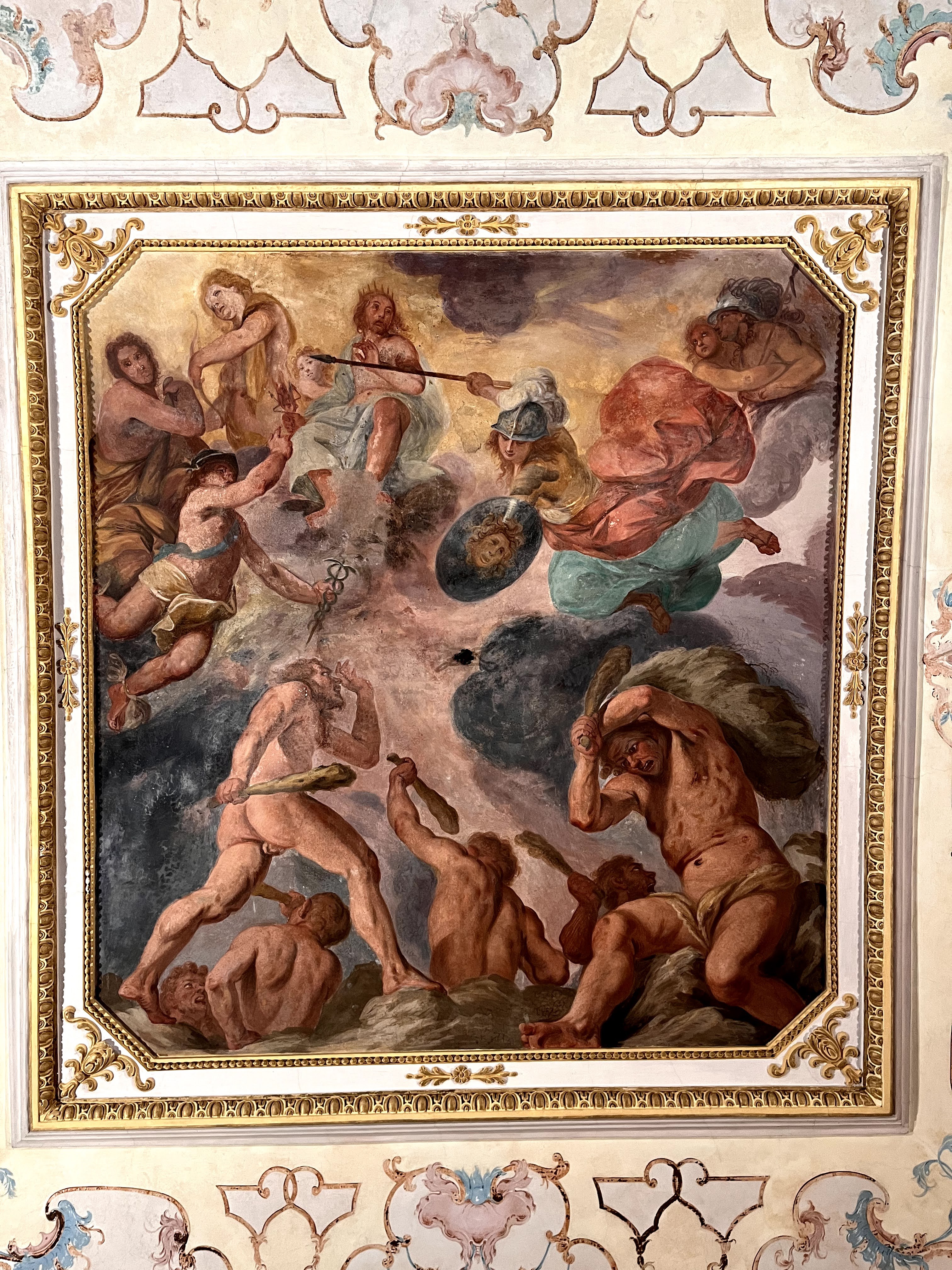 Nella “Sala dei giganti” il medaglione seicentesco al centro del soffitto rappresenta il momento in cui le divinità olimpiche reagiscono all’assalto dei Giganti, che accumulando macigni uno sull’altro, cercano di salire per tentare la conquista dell’Olimpo. Nel racconto delle Metamorfosi di Ovidio è lo stesso Giove che con i suoi lampi fa crollare la montagna di sassi, travolgendo e annientando i Giganti, come nello straordinario esempio di Palazzo Te a Mantova. Qui a Cesano è presente una variante, Bartolomeo sceglie per vincere i Giganti Minerva, che è si una divinità guerriera, infatti è raffigurata con l’elmo, la lancia e lo scudo, ma è anche la dea della Sapienza e allora è lampante comprendere che le guerre si vincono sì con le armi, ma soprattutto con l’intelligenza e l’astuzia. Con questo affresco Bartolomeo vuole affermare quanto la sapienza sia fondamentale per il raggiungimento di risultati positivi. Altri particolari lo sottolineano: oltre a Minerva e ai giganti sconfitti, nell’affresco sono presenti Giove, protetto dalla lancia di Minerva e con la corona in testa (chiaro richiamo a Filippo quarto di Spagna), Diana che tiene in mano l’arco, Mercurio col caduceo ed Ercole, che invece di dar man forte a Minerva se ne sta seduto con la clava tra le gambe; nell’altro lato compare anche Marte con l’elmo in testa, e anche lui non interviene, tutto questo per ribadire che è più che sufficiente la sola Minerva per conquistare la vittoria. Altro elemento interessate da osservare è che tutte le divinità hanno espressioni preoccupate, in particolare Giove, solamente Minerva è serena, conscia appunto delle sue capacità e della sicura vittoria. Nella preoccupazione di Giove e nell’inerzia degli altri dei guerrieri, possiamo dare una seconda lettura in chiave politica, un messaggio che Bartolomeo voleva indirizzare ai potenti, ovvero che è buona cosa non sentirsi mai eccessivamente sicuri di se stessi, ma di stare sempre in guardia, in miniera particolare se si rivestono ruoli di potere.