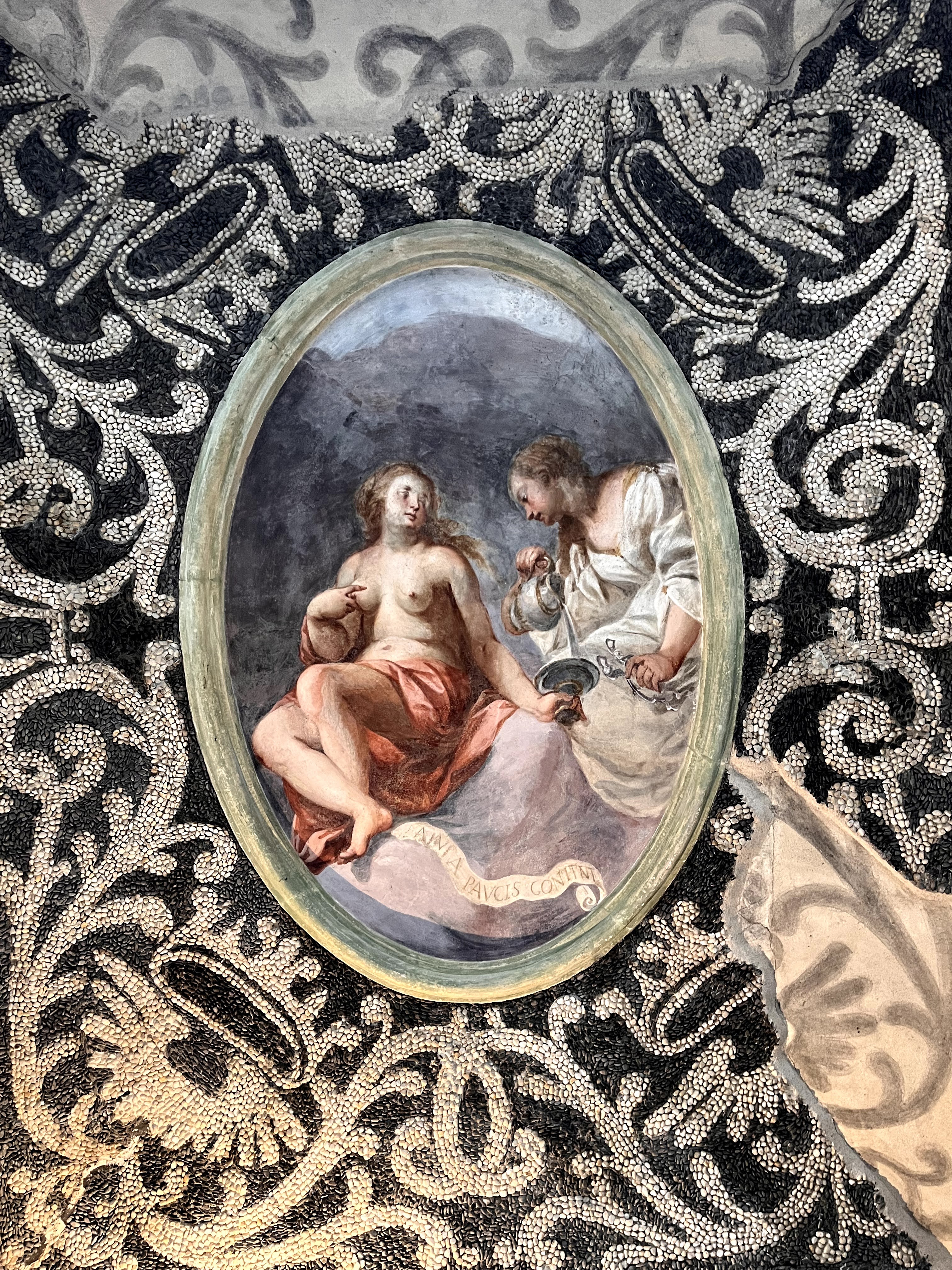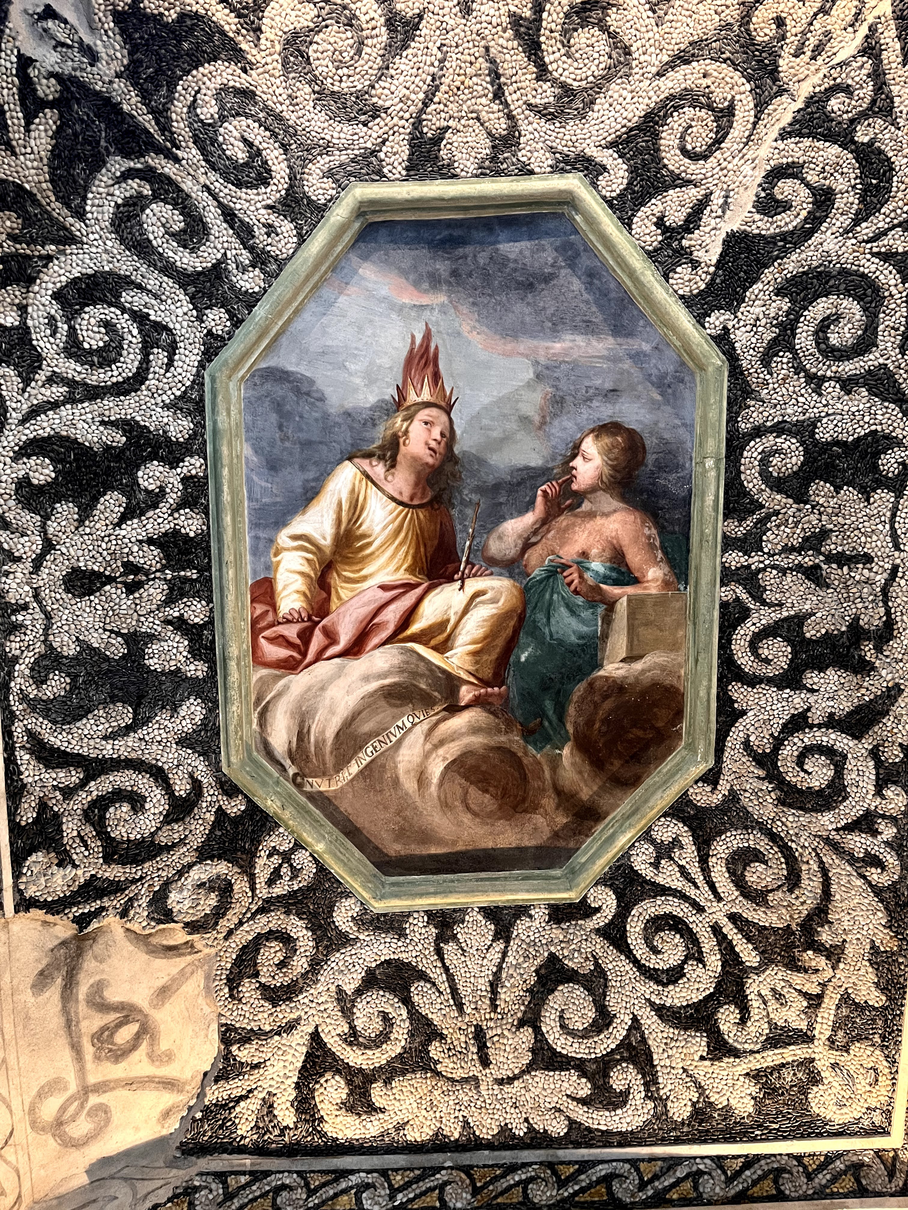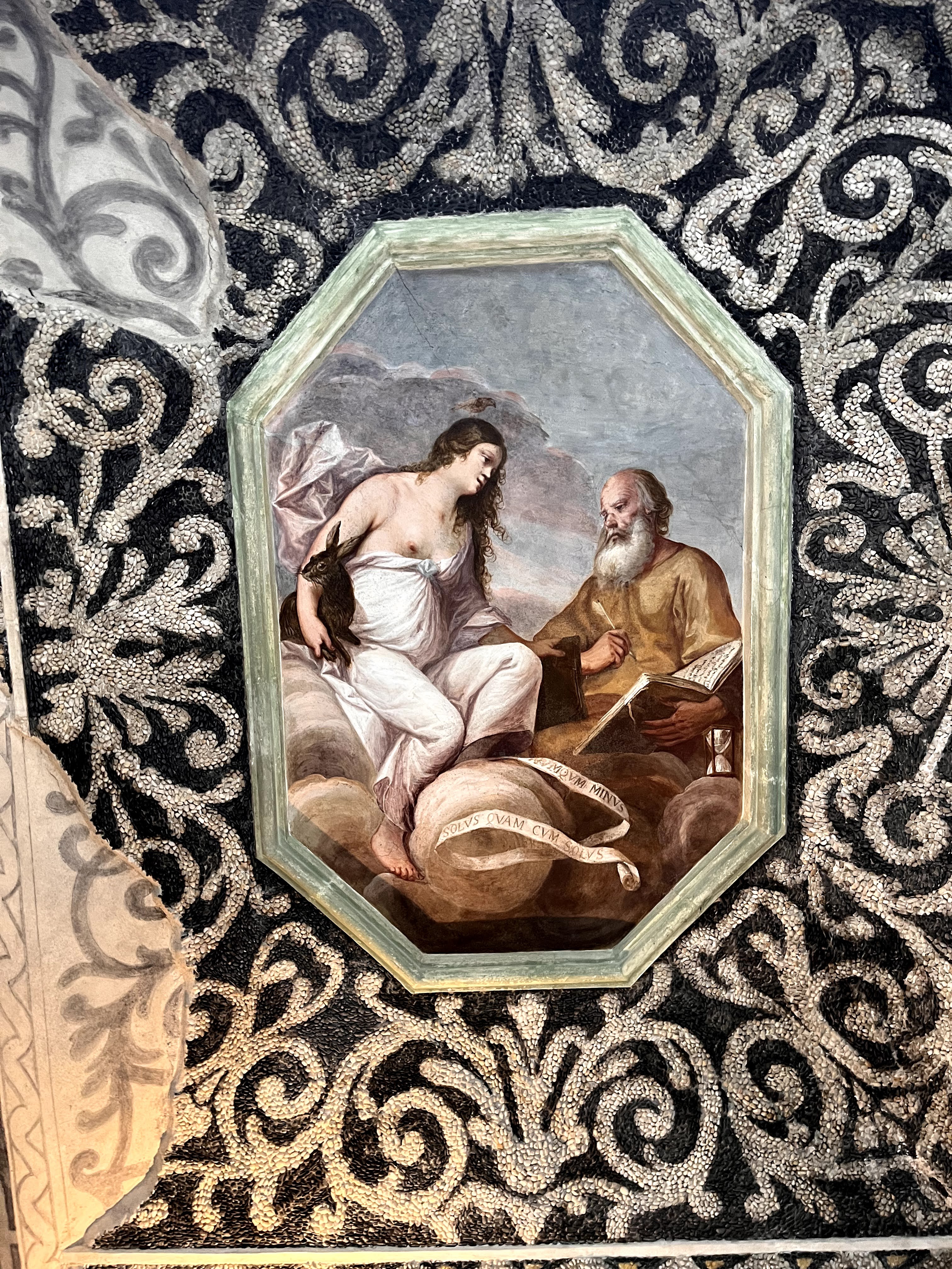 Ultima sala è “Appartamento alla Mosaicha“, oggi impropriamente definito “Ninfeo“, le sue caratteristiche sono tipiche di questi ambienti che solitamente si trovano al termine dei giardini, ma qui a Cesano è all’interno del Palazzo stesso, perdendo le finalità tipiche di questi ambienti. Pavimento, pareti e volte sono interamente rivestite da un mosaico di piccoli sassolini di fiume bianchi e neri che realizzano ampi disegni decorativi, tipicamente barocchi. Di nuovo si ritrova il gioco illusionistico fra interno ed esterno. Sempre sui soffitti ritroviamo degli affreschi che richiamano alla saggezza, in particolare l’opera “Il saggio e la Solitudine”, che sta ad indicare come l’uomo saggio rimanendo in solitudine, senza distrazioni, può riflettere con attenzione e tranquillità dando così il meglio di sé e senza sprecare tempo. In questa immagine abbiamo riassunti alcuni dei punti chiave del pensiero di Bartolomeo: l’indispensabile crescita culturale dell’individuo si attua attraverso la continua applicazione e conoscenza, utilizzando al meglio le proprie capacità e sfruttando al meglio il tempo che ineluttabilmente trascorre.