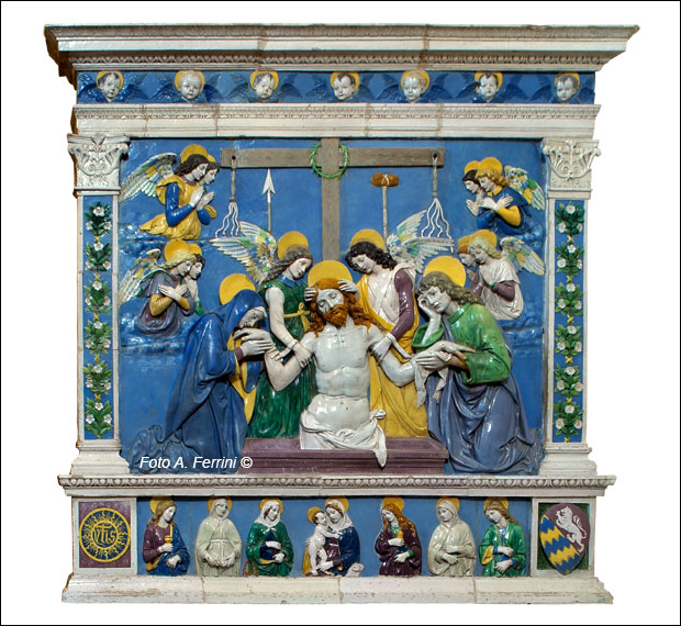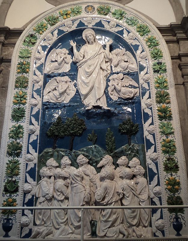 Nei manuali di storia dell’arte, Andrea Della Robbia è noto per il cantiere dell’Ospedale degli Innocenti a Firenze, dove fra gli archi del Brunelleschi sono presenti questi tondi di terracotta invetriata. Invece a Chiusi della Verna le ceramiche assumono un ruolo maggiore, essendo l’elemento decorativo preponderante. Soliti a vedere la terracotta per la realizzazione di opere di piccolo e medio formato, vedere le grandi dimensioni delle opere della bottega ci lasciano a bocca aperta; nella navata dell’Assunta si susseguono terracotte raffiguranti episodi e iconografie miliari della storia di Maria e di Gesù, dall’Annunciazione alla Resurrezione, il tutto in grande formato come se fossero tele cinquecentesche.