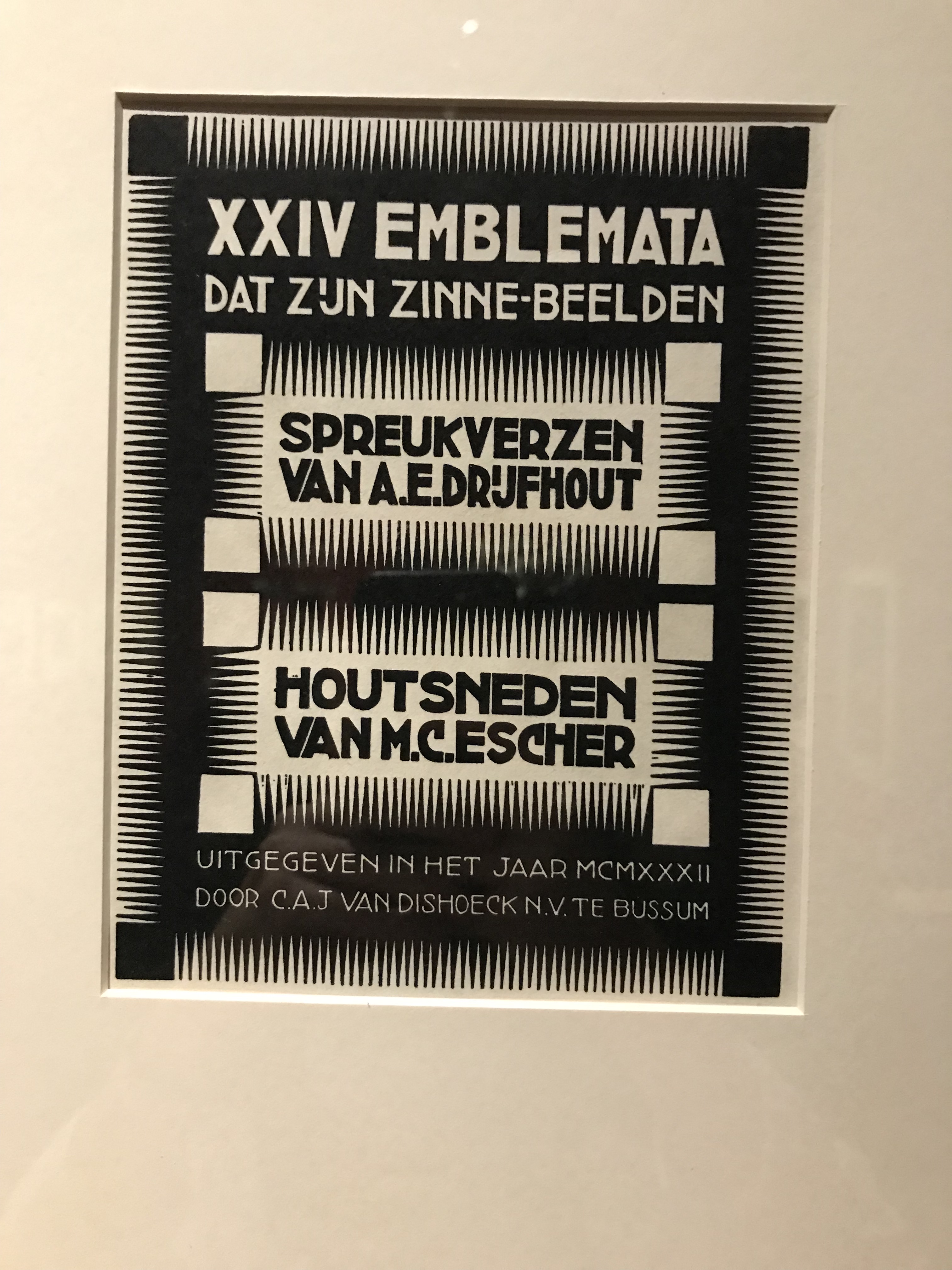 Nel 1932 Escher pubblica un libro molto interessante dal titolo Emblematica, una serie di xilografie raffiguranti proverbi in latino con commento in olandese. La produzione è eterogenea sia nello stile della scrittura sia nella rappresentazione dei soggetti. L’opera si pone sul filone della tradizione fiamminga dei proverbi e della tradizione popolare, le stampe si propongono come uno spunto di riflessione tramite un linguaggio efficace che combina la scrittura a complemento dell’immagine.