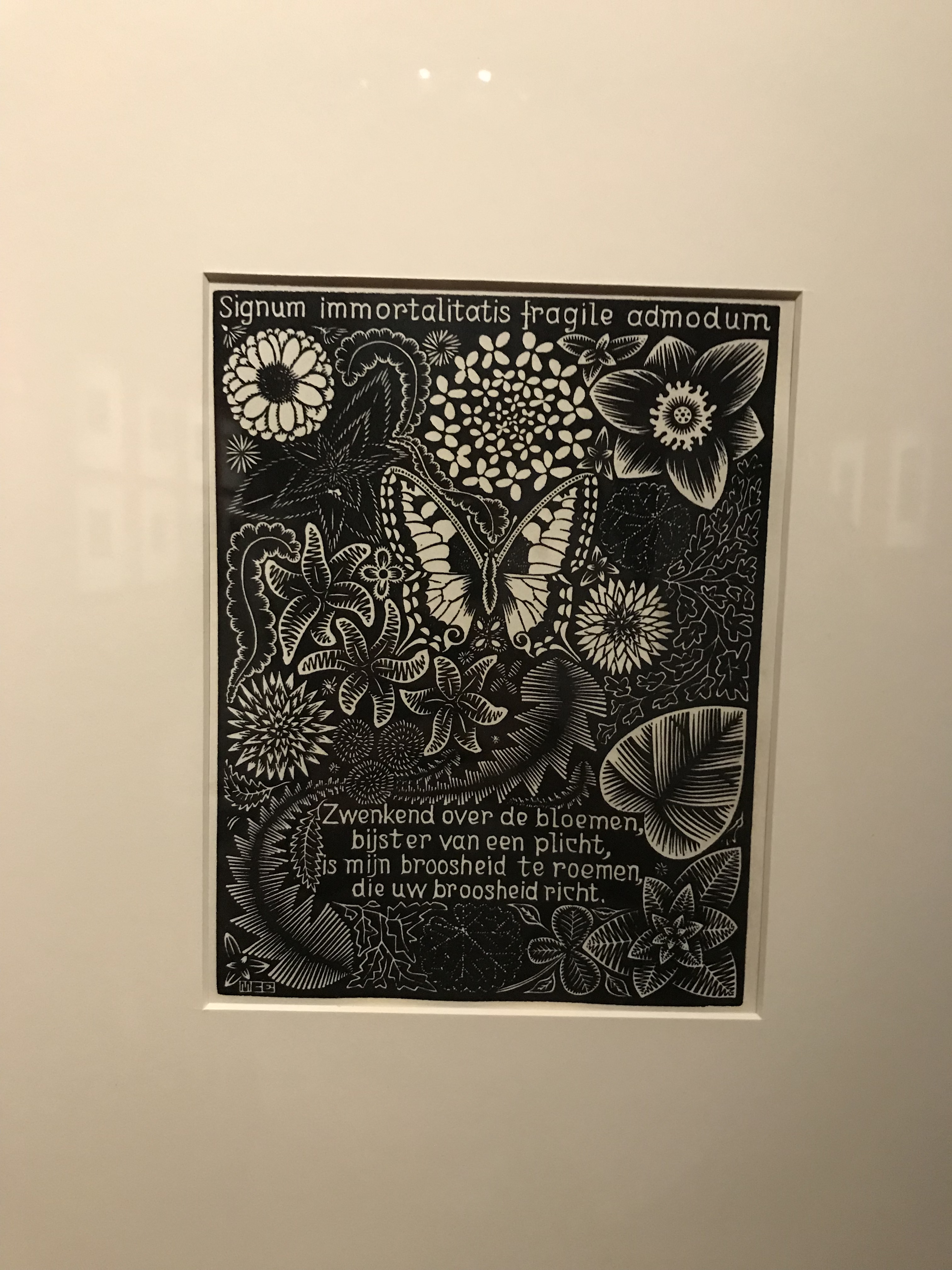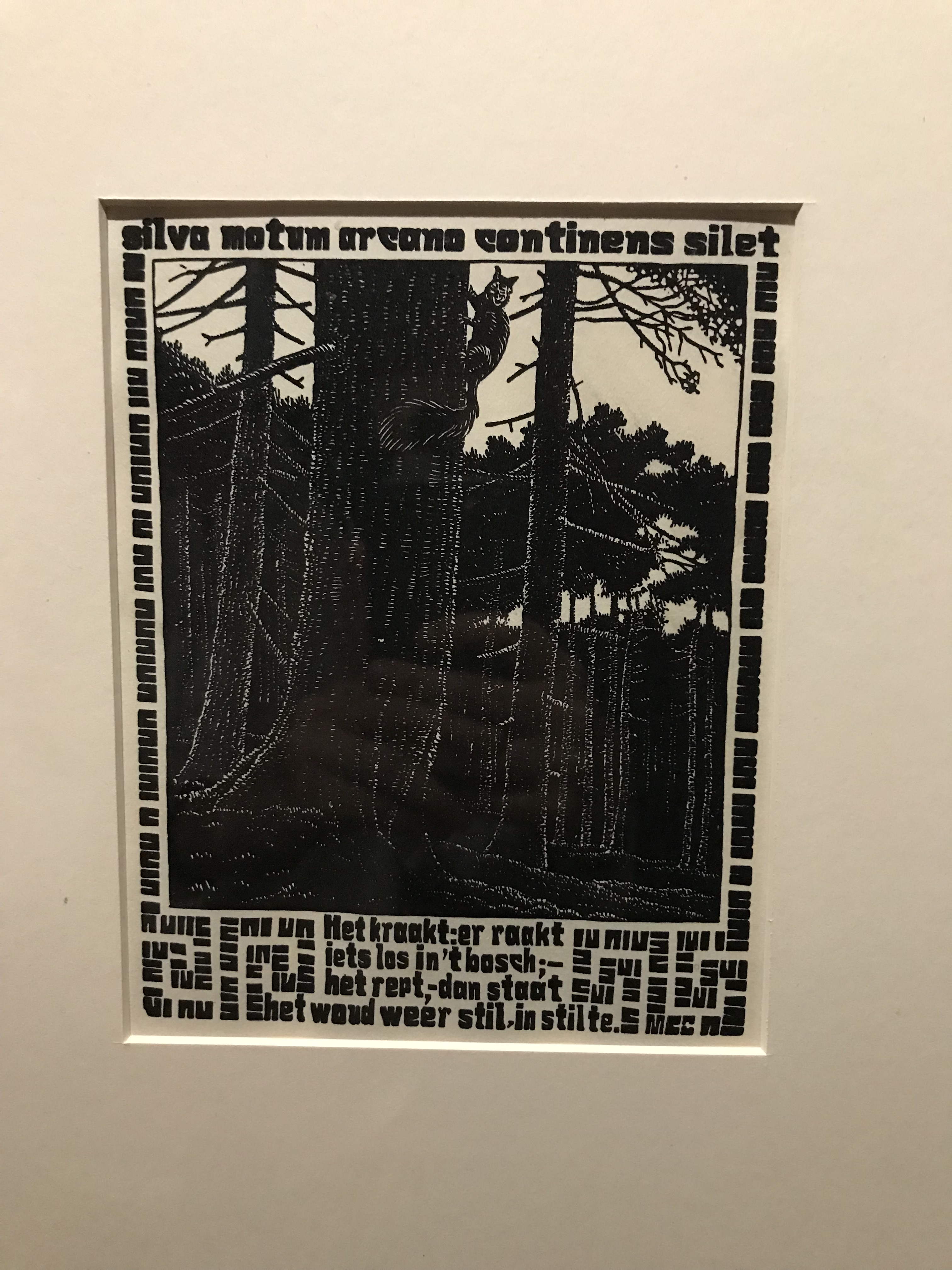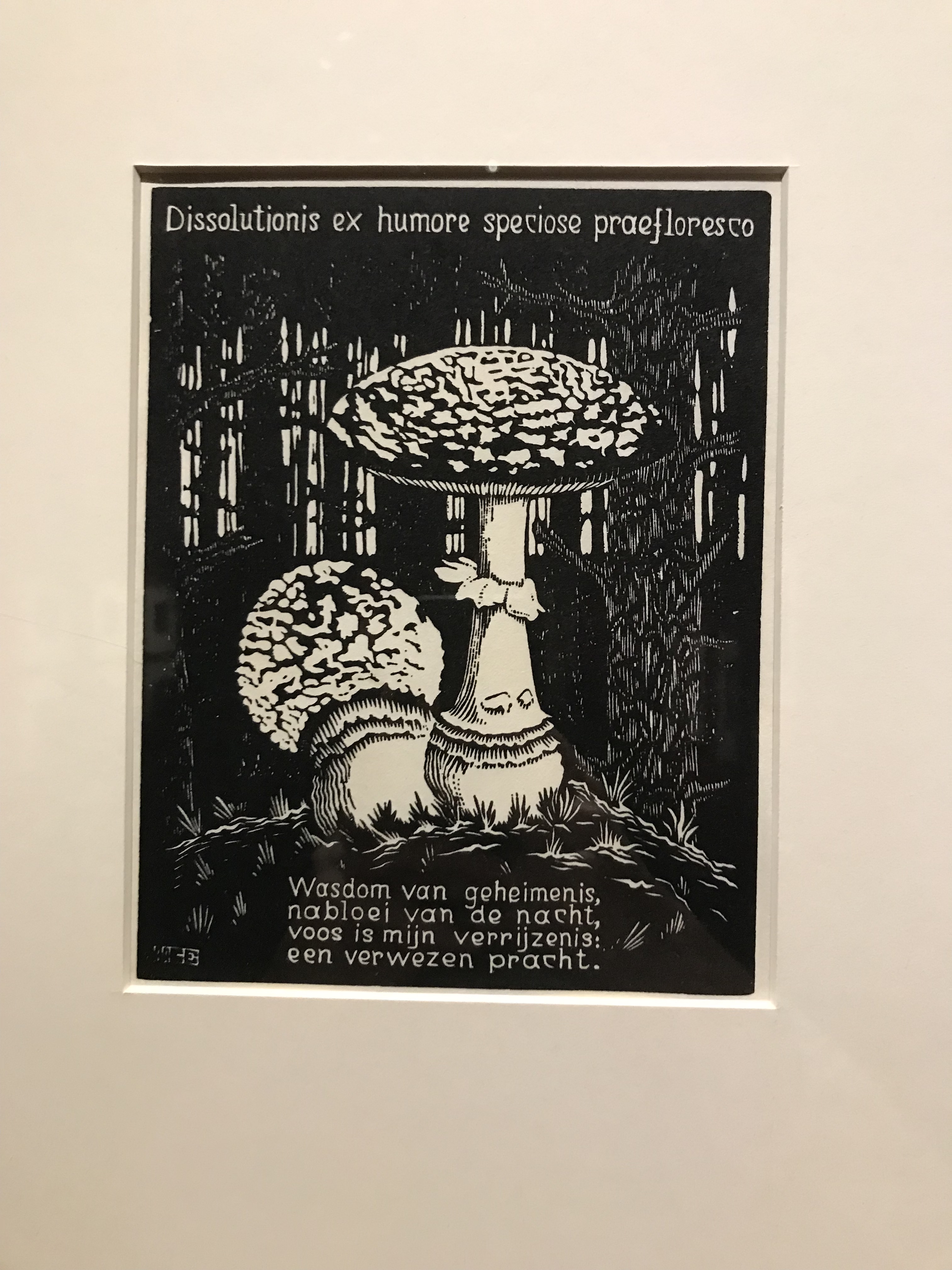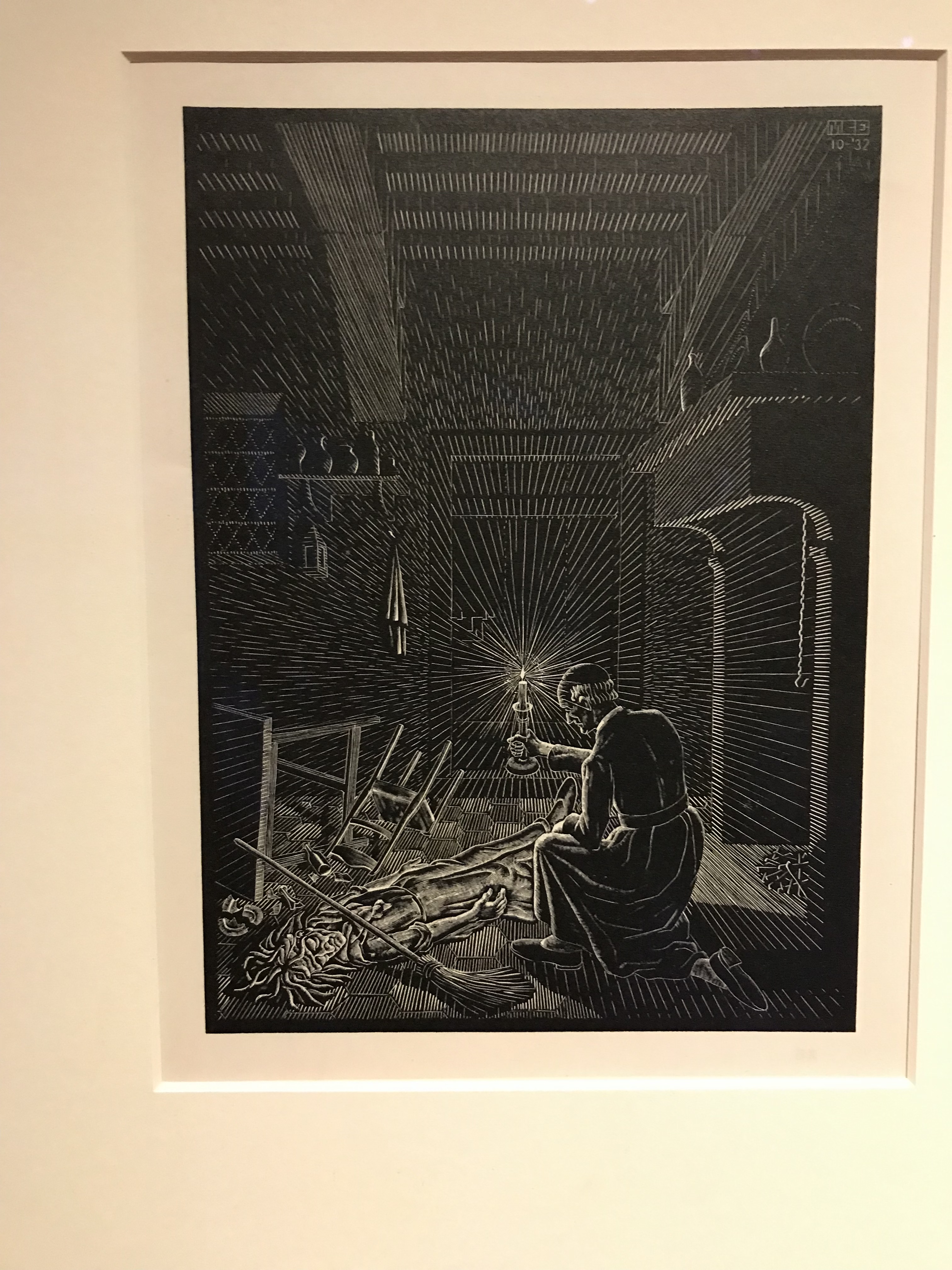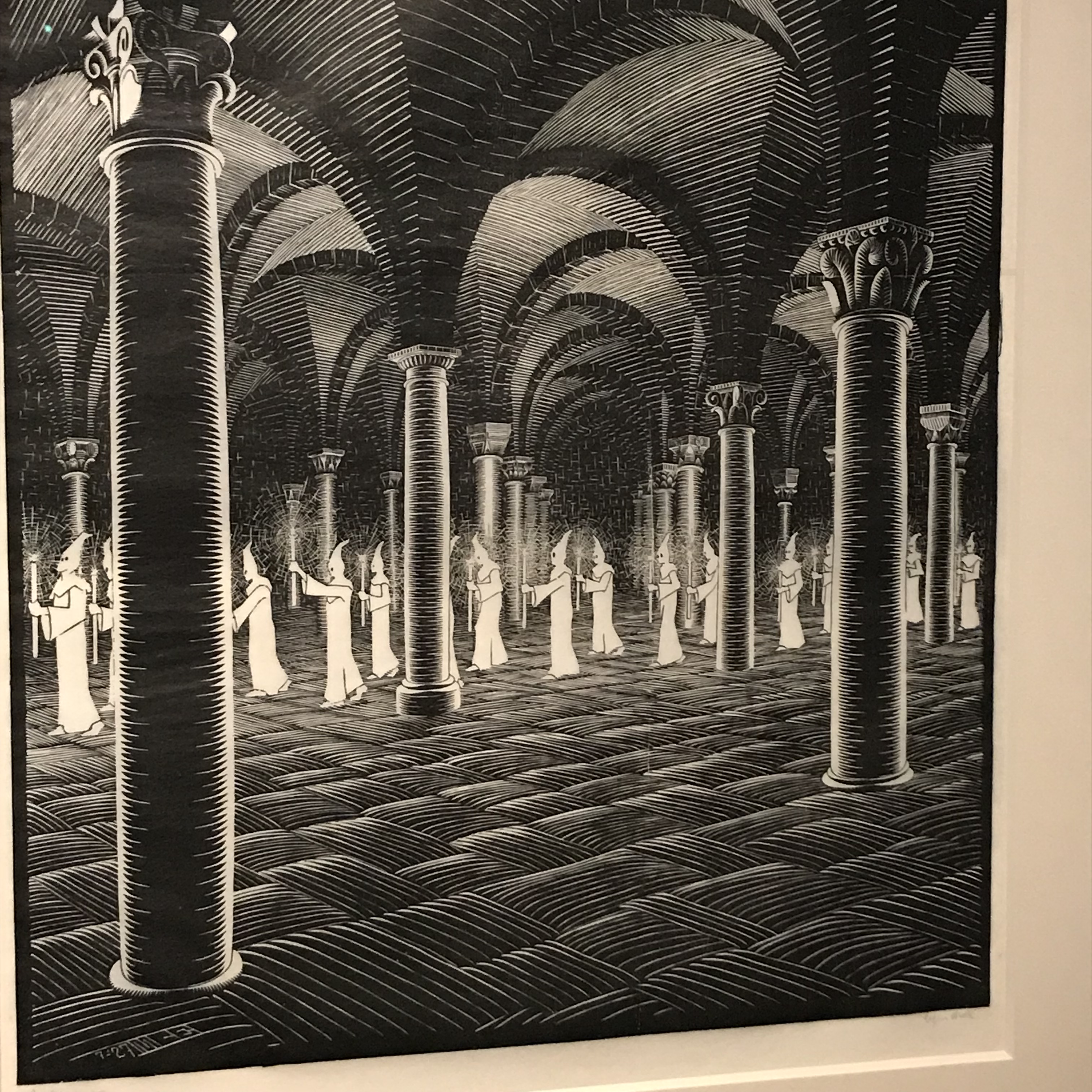 La parte più interessante della mostra, a mio avviso, sono le prime sezioni dell’esposizione, dove l’attenzione è dedicata alla prima produzione. In queste stampe viene meno la parte illusionistica e geometrica, per lasciare spazio ai soggetti naturalistici. Questo linguaggio si rivela da subito estremamente grafico: un grande uso del nero che crea un forte contrasto con le linee di luce, che non si camuffano nella stampa ma ne sono un tratto distintivo. Si nota anche una predilezione per l’uso di matrice lignea, che rende i contorni più netti. Questo è il denominatore comune delle prime xilografie esposte nella prima saletta: Extasi, Cactus, il Grande Airone e La processione nella Crypta.