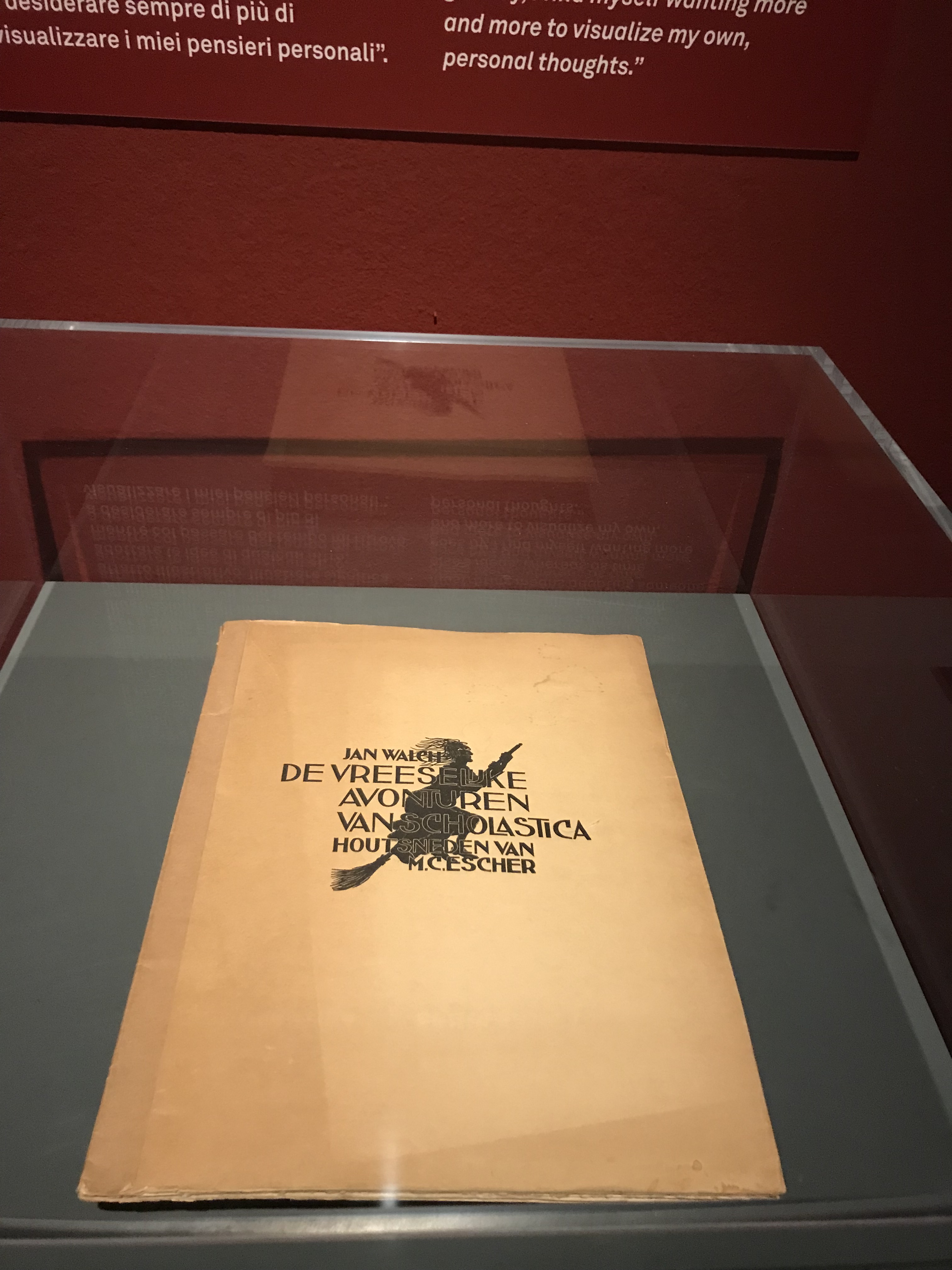 Nella stessa sala, di seguito alla serie sulla creazione sono esposte qualche illustrazione tratta dal libro De vreeselijke avonturen van Scholastica (Le terribili avventure di Scholastica). Il volume, anch’esso esposto in mostra, tratta la vicenda bizzarra di questo paesino, che si dimostrava più clemente nella caccia alle streghe: utilizzando come prova del nove la pesa dell’accusata, secondo la teoria per la quale le streghe (esseri ultraterreni) pesino meno rispetto agli umani “normali”. Il libro ebbe molto successo, ma nonostante ciò fu l’ultima illustrazione di Esche che dichiarò: