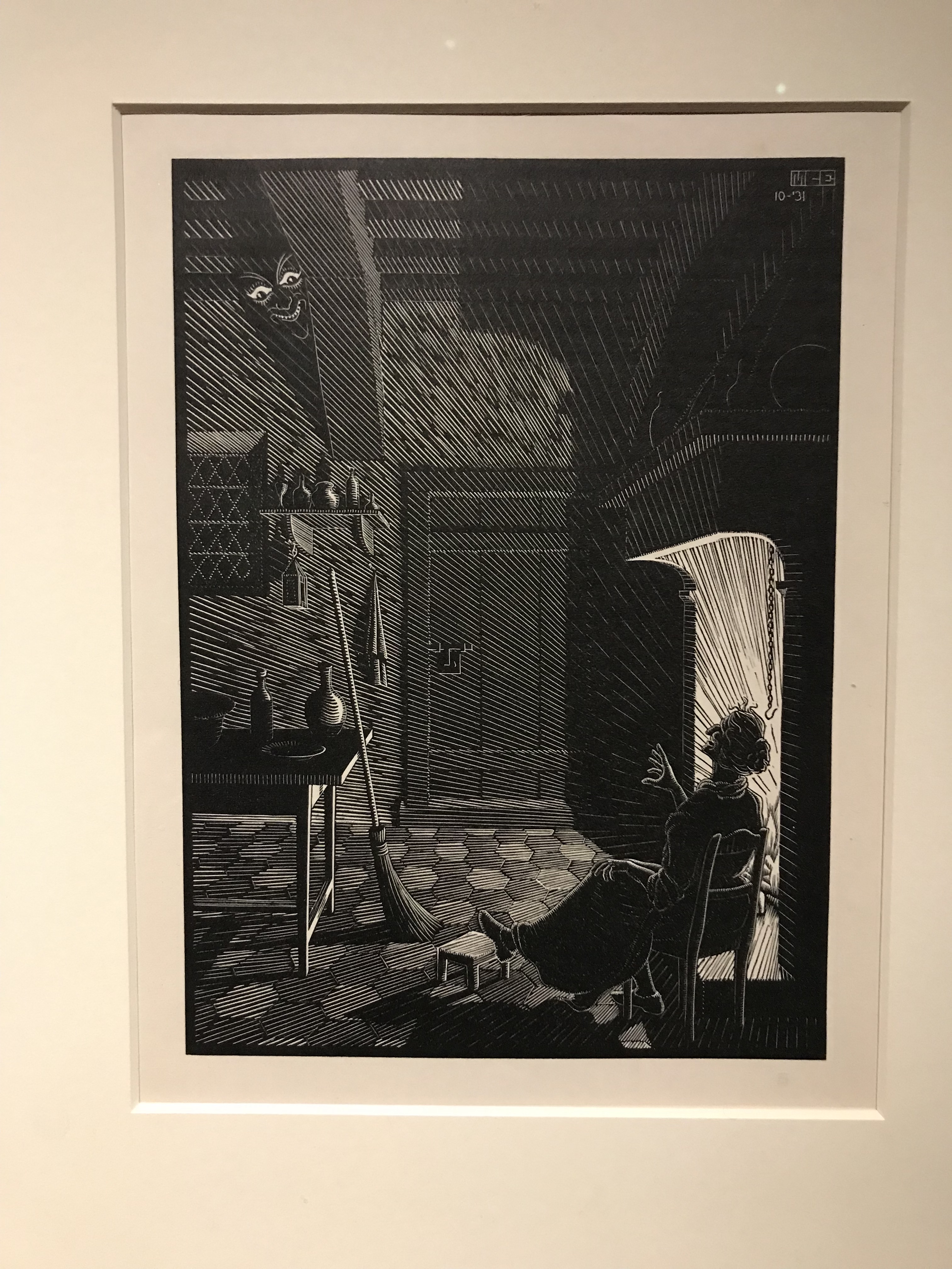 Nel 1936 Escher realizza un viaggio con la moglie in Spagna, per la precisione a Granada, dove visitarono l’Alahmbra, monumento del rinascimento ispano-moresco. La decorazione geometrica ed elegante colpì moltissimo l’artista che cominciò ad avvicinarsi alle geometrie e le riproduzioni del piano. Da qui la mostra perde il filo cronologico cominciando un percorso interattivo e tematico, esponendo le opere che hanno reso Escher l’artista grafico di fama mondiale. L’interesse per la matematica, la geometria e lo studio dello spazio diventano protagonisti della produzione dell’artista olandese, incastrando personaggi simili o speculari nel piano della sua opera e utilizzando forme impossibili come il trigramma. La mostra si chiude con delle piccole sale dedicate al “Escher mania“, ovvero l’eco che ebbe, e che tutt’ora ha, la produzione di Escher passando dalla musica fino ai film più recenti.
