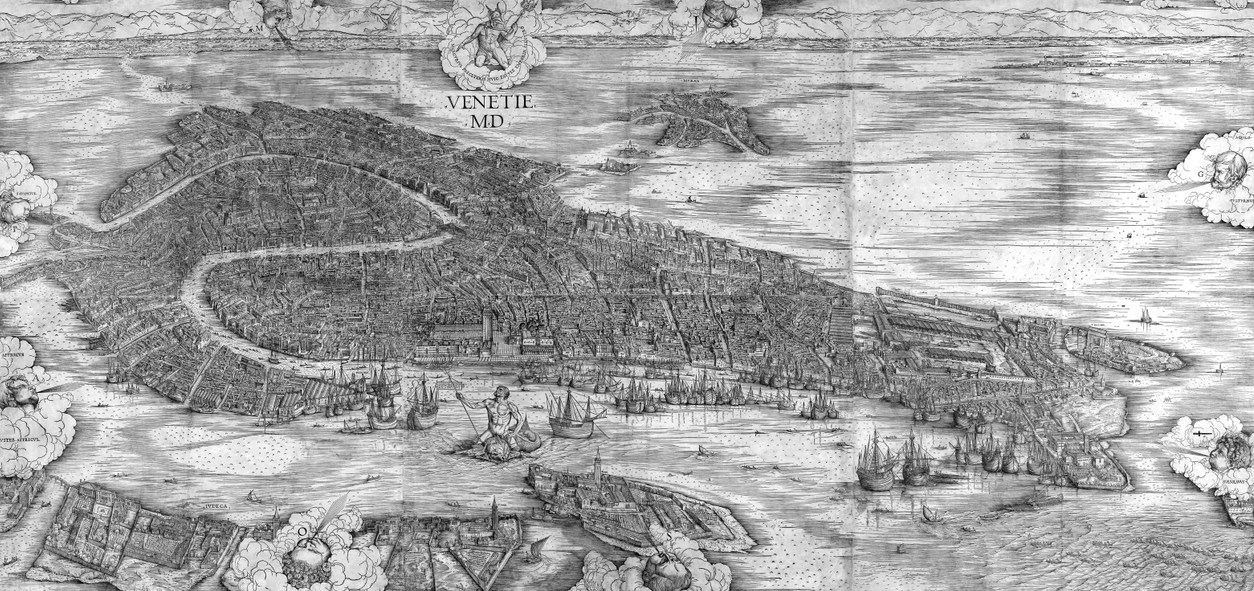 La Veduta di Venezia a volo d’uccello, di Jacopo de’ Barbari, è un’opera su cui vale la pena soffermarsi: datata 1500 è uno dei più grandi capolavori della cartografia urbana. La sua matrice si può ammirare, sempre in modo permanente, all’interno del Museo Correr. La stampa è una monumentale xilografia che descrive dettagliatamente la città, e ci permette di immaginare, come se avessimo davanti una fotografia, la Venezia dei primi anni del XVI secolo.