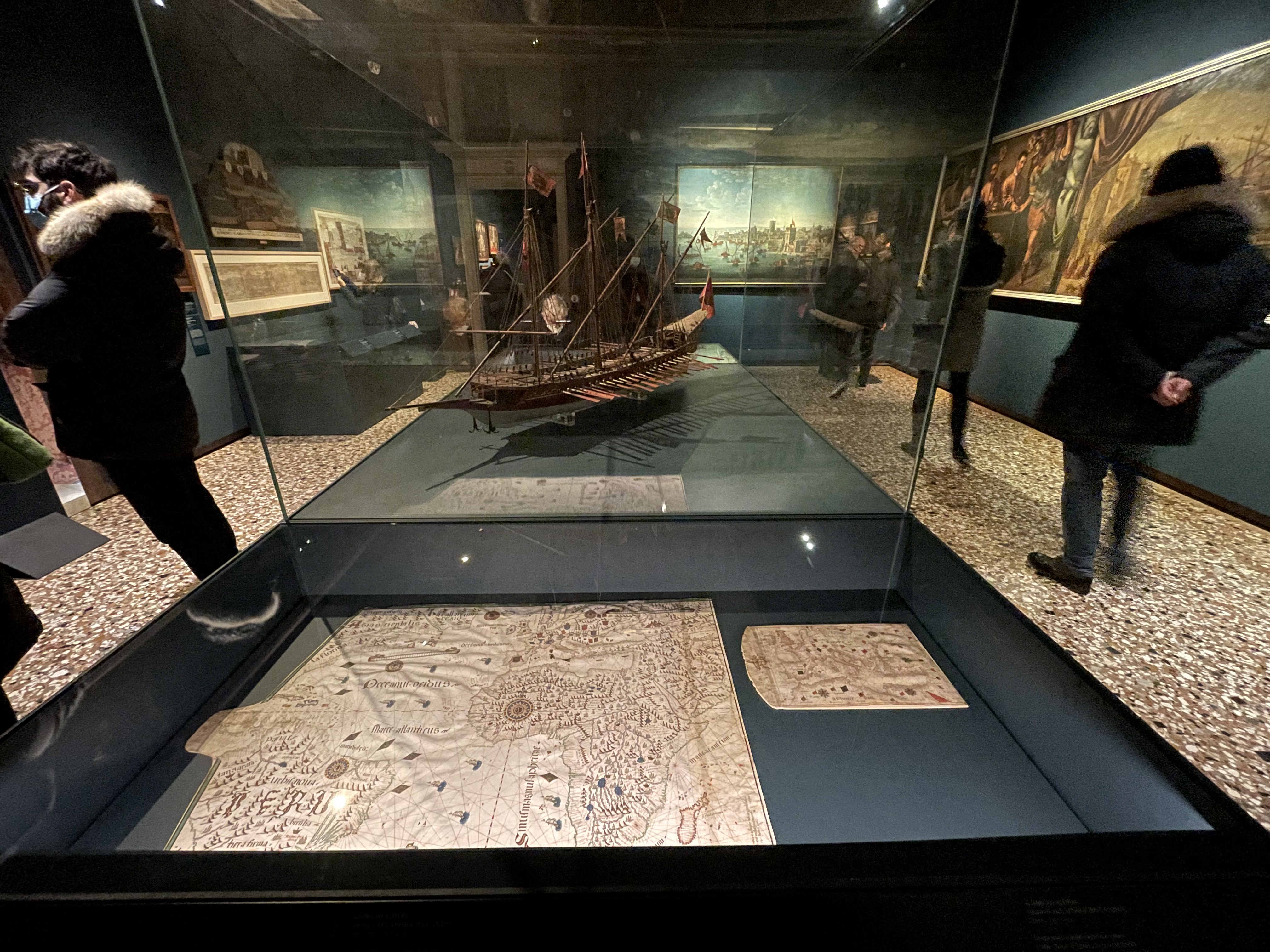 Camminando virtualmente nella mostra, le Sale 3 e 4 accolgono opere molto interessanti, che raramente si ha l’occasione di vedere esposte: mappe nautiche, modellini in legno di antiche barche, contamonete, antichi tessuti, manufatti in vetro e oggettistica di provenienza bizantina. Le due sale sono dedicate rispettivamente alla Venezia marittima e alla Venezia come città di mercanti. Quese possono risultare un po’ dispersive, ma la rarità di alcuni manufatti e il fatto che, davvero raramente, oggetti di questo tipo vengano esposti, fa di queste un plus in più all’interno dell’esibizione.