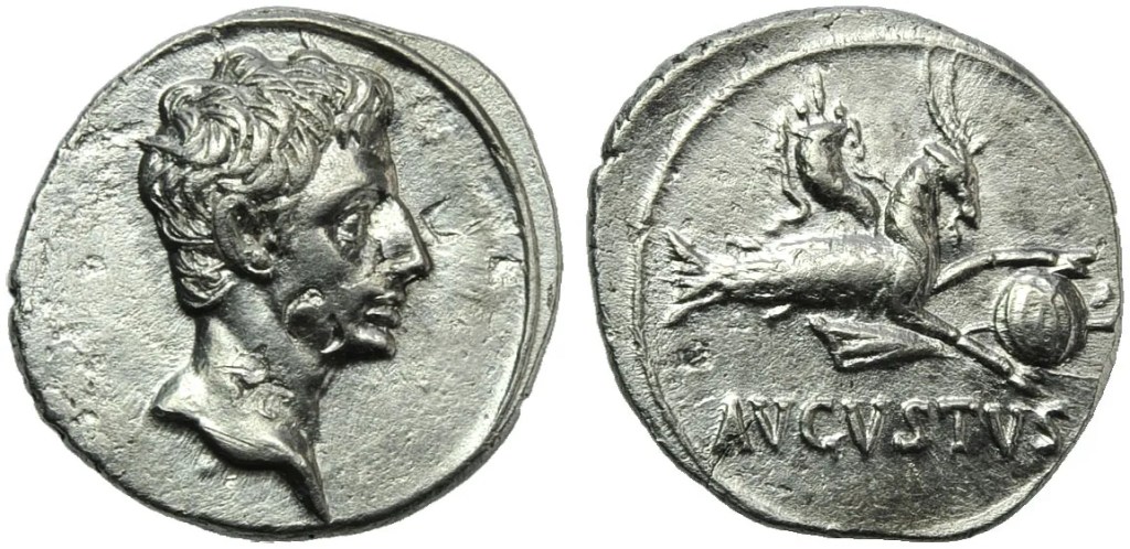 Sul rovescio dei denari romani dell’epoca imperiale è incisa l’immagine del Capricorno che governa il mondo come rappresentazione dell’imperatore Augusto stesso, e ad indicare l’abbondanza e la ricchezza raggiunte dalla civiltà romana al suo apice.
